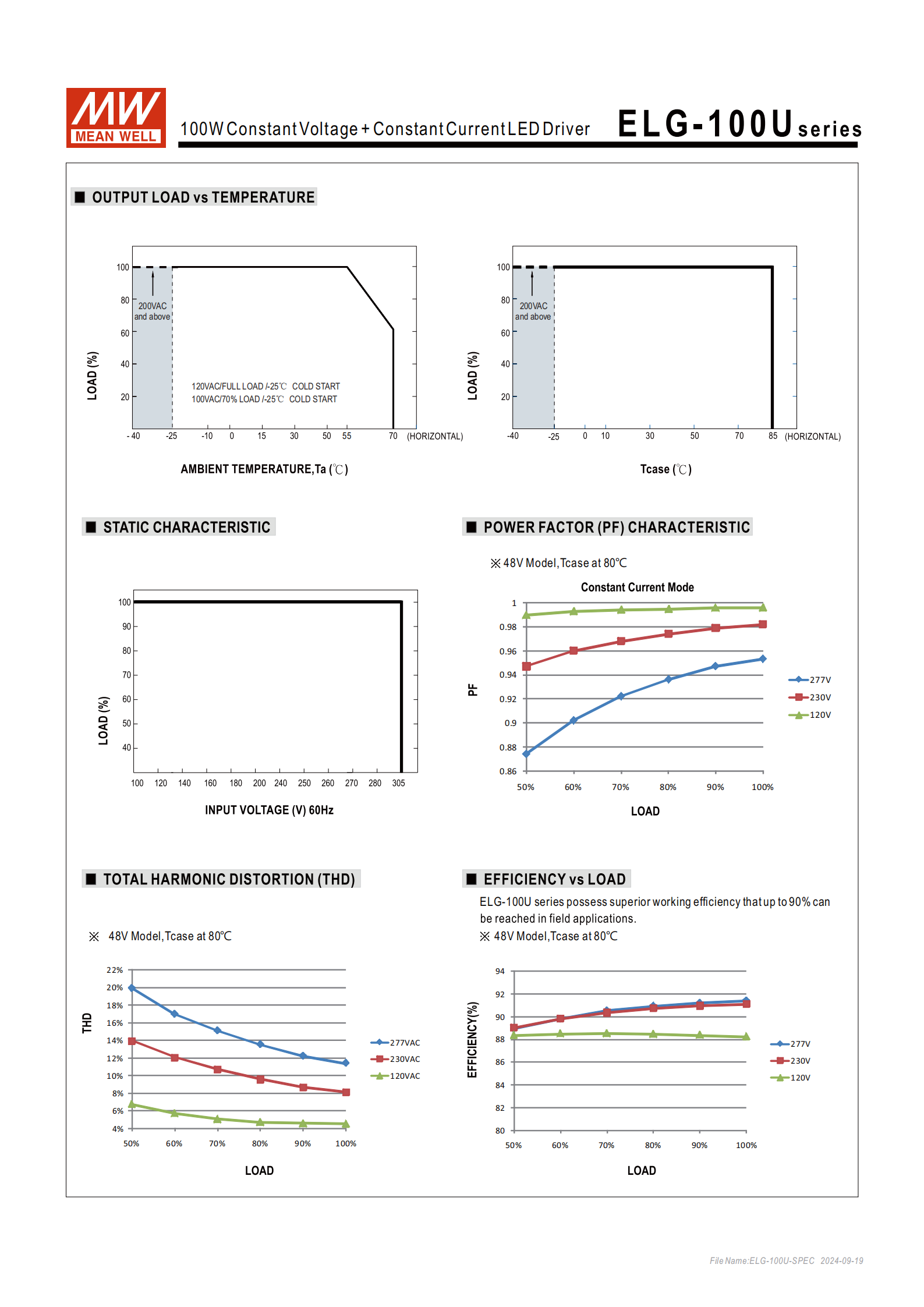 3. 總諧波失真:THD<20%(負(fù)載≧50%/120VAC、≧60%/230VAC、≧75%/277VAC);