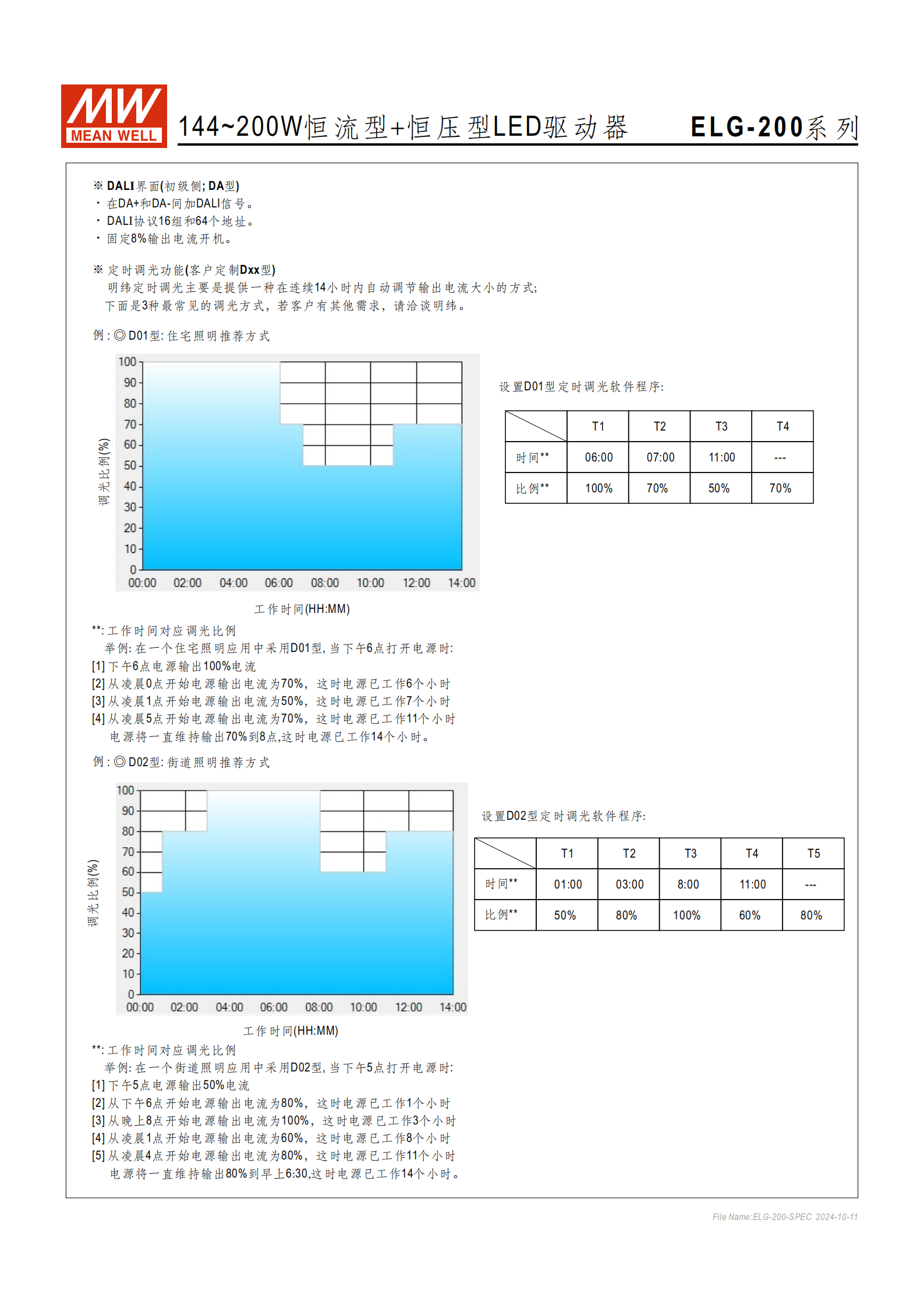 經典模式:D01(住宅照明)、D02(街道照明)、D03(隧道照明),各模式按工作時長劃分不同調光比例區(qū)間。