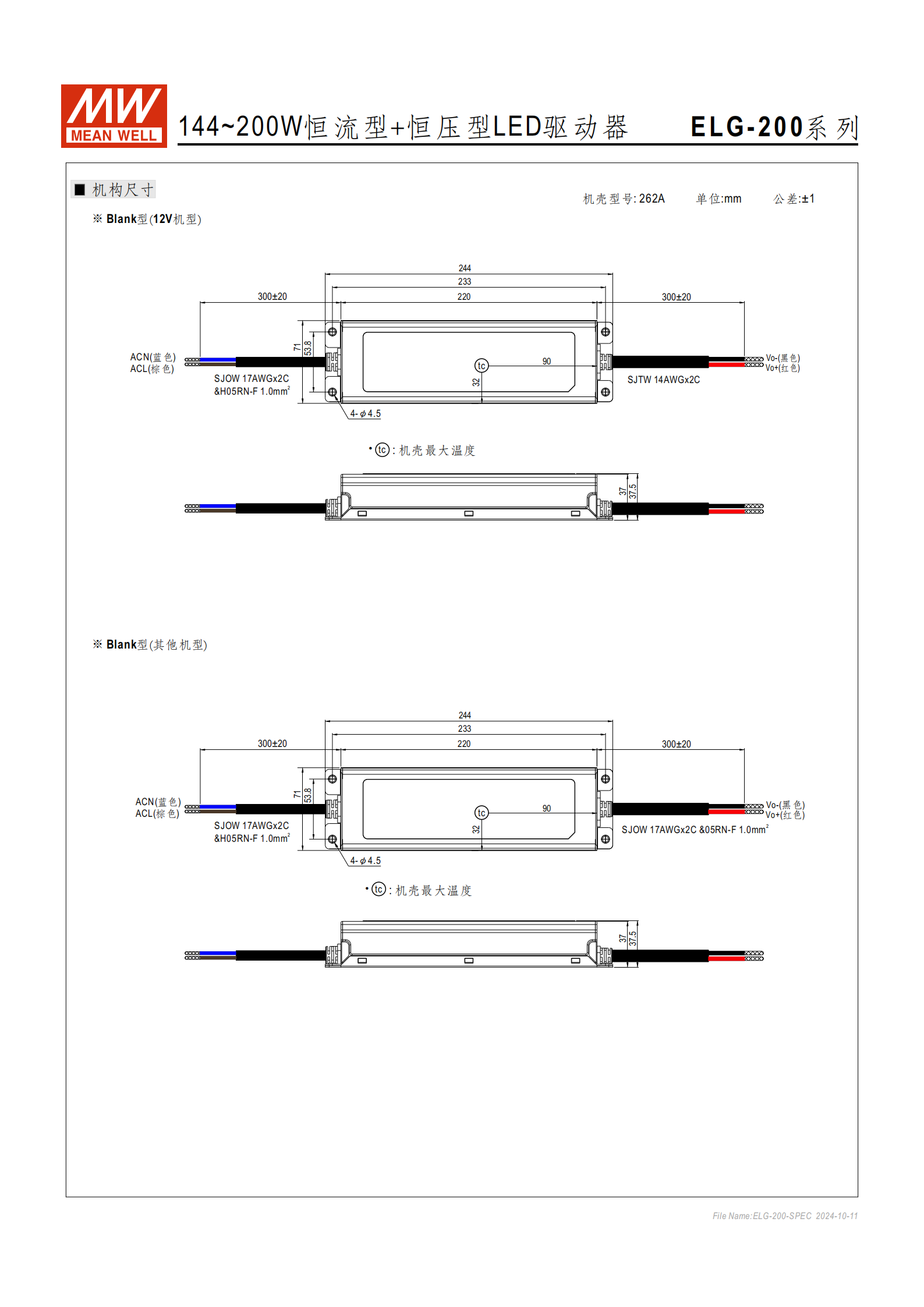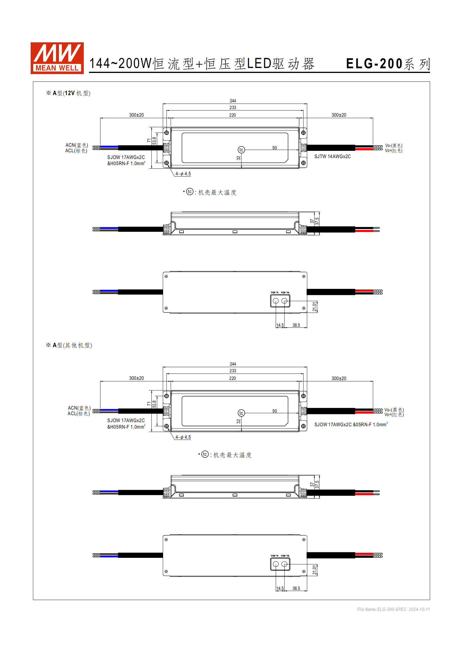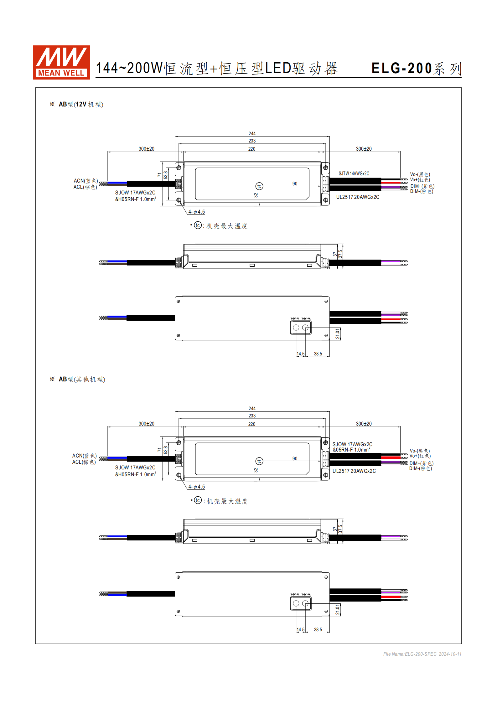 輸出參數(shù)不同額定電壓機(jī)型的核心輸出參數(shù)如下表,僅 A/AB 型可通過內(nèi)部電位器調(diào)整電壓 / 電流:| 型號 | 額定輸出電壓 | 額定電流 | 額定功率(100~180VAC/200~305VAC) | 電壓調(diào)整范圍 | 電流調(diào)整范圍 | 紋波與噪聲(最大) ||--------------|--------------|----------|----------------------------------|--------------|--------------|--------------------|| ELG-200-12 | 12V | 16A | 144W / 192W | 11.2~12.8V | 8~16A | 350mVp-p || ELG-200-24 | 24V | 8.4A | 150W / 201.6W | 22.4~25.6V | 4.2~8.4A | 250mVp-p || ELG-200-36 | 36V | 5.55A | 149.76W / 199.68W | 33.5~38.5V | 2.78~5.55A | 250mVp-p || ELG-200-42 | 42V | 4.76A | 149.94W / 200.88W | 39~45V | 2.38~4.76A | 200mVp-p || ELG-200-48 | 48V | 4.16A | 149.76W / 199.8W | 44.8~51.2V | 2.08~4.16A | 250mVp-p || ELG-200-54 | 54V | 3.72A | 150.12W / 199.9W | 50~57V | 1.86~3.72A | 150mVp-p |