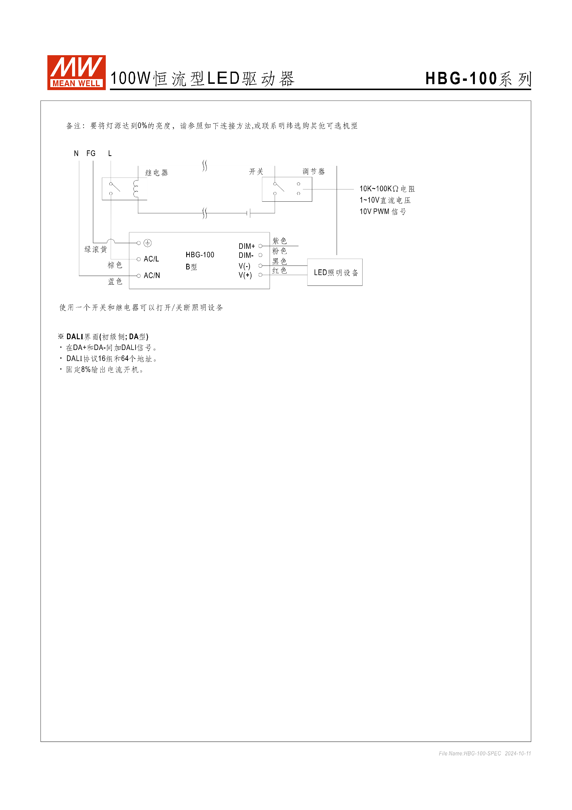 全系列滅燈:需通過(guò)開(kāi)關(guān) + 繼電器 + 1~10Vdc/PWM/ 電阻組合實(shí)現(xiàn),無(wú)直接 0% 亮度調(diào)檔,可咨詢(xún)明緯選購(gòu)專(zhuān)屬機(jī)型。