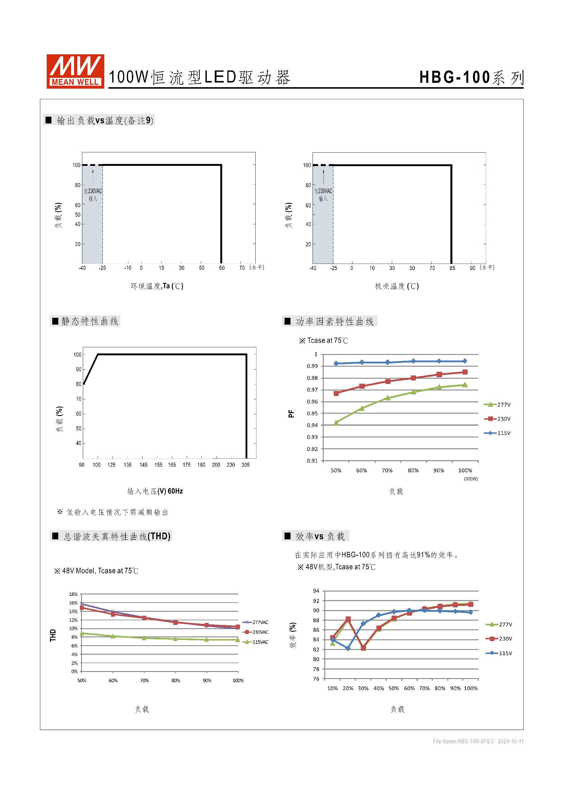 核心特性曲線:輸出負(fù)載 vs 環(huán)境 / 機(jī)殼溫度、靜態(tài)特性、THD / 功率因數(shù) / 效率 vs 負(fù)載、壽命 vs 機(jī)殼溫度曲線,均為產(chǎn)品應(yīng)用的重要參考(低電壓 / 高溫需減額)。