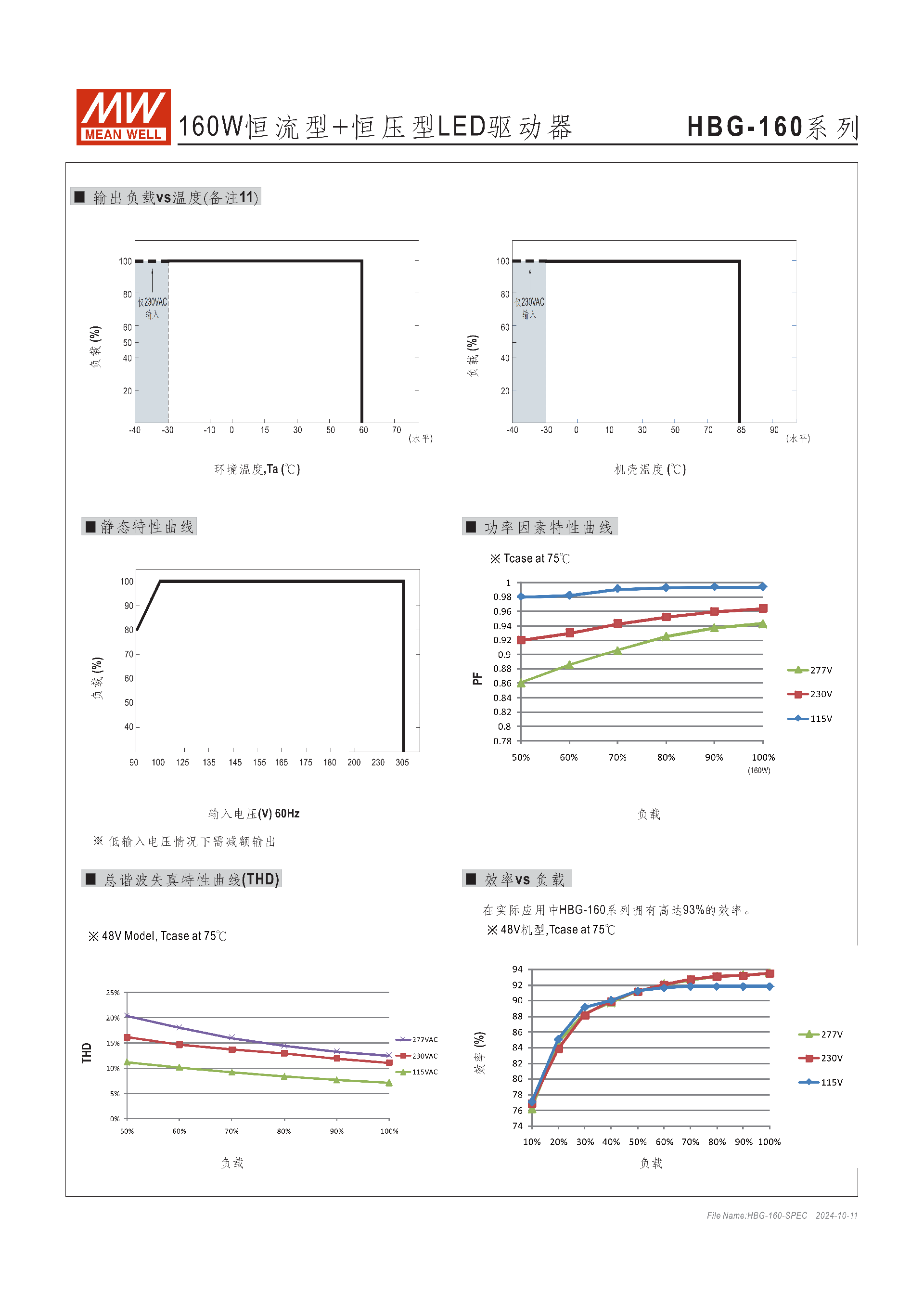 電氣核心:內(nèi)置主動式 PFC 功能,功率因數(shù)滿載時≥0.98 (115VAC)/≥0.95 (230VAC)/≥0.92 (277VAC),總諧波失真 THD<20%(不同電壓負載要求不同);