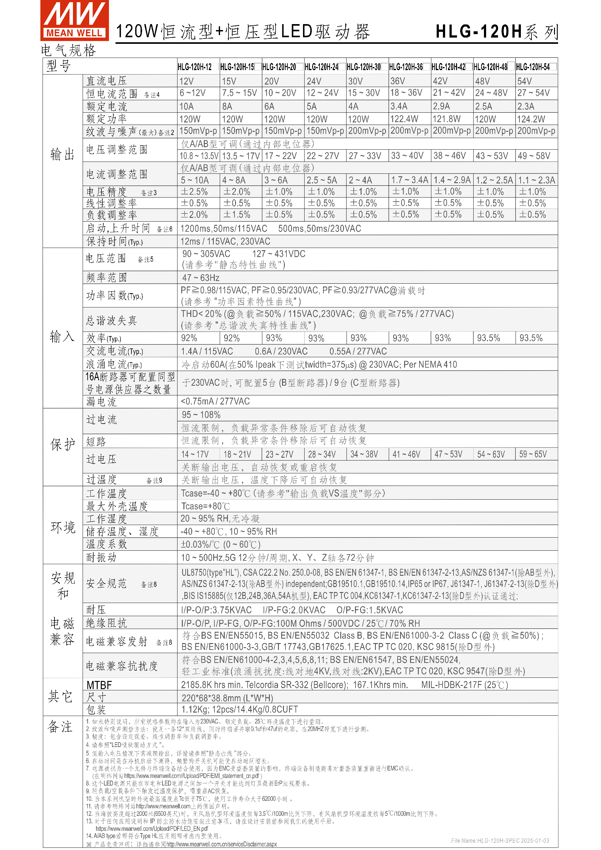系列型號編碼為HLG-120H-XX(額定輸出電壓)- 功能模式,輸出電壓涵蓋 12/15/20/24/30/36/42/48/54V 九檔,功能模式分 5 類,核心參數(shù)如下:
