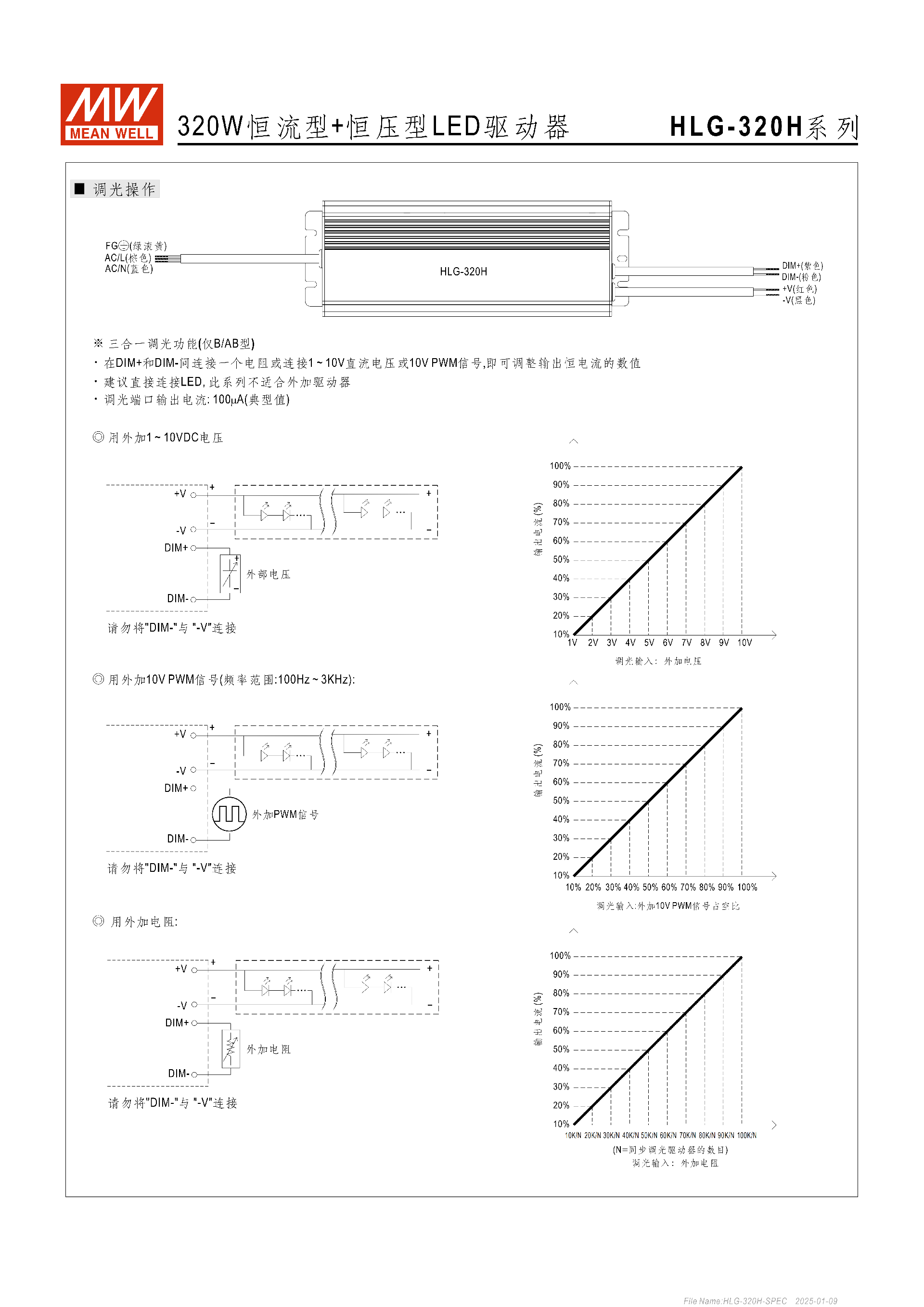 調(diào)光方式:1~10Vdc 直流電壓、10V PWM 信號(頻率 100Hz~3KHz)、外接電阻(10K~100KΩ);