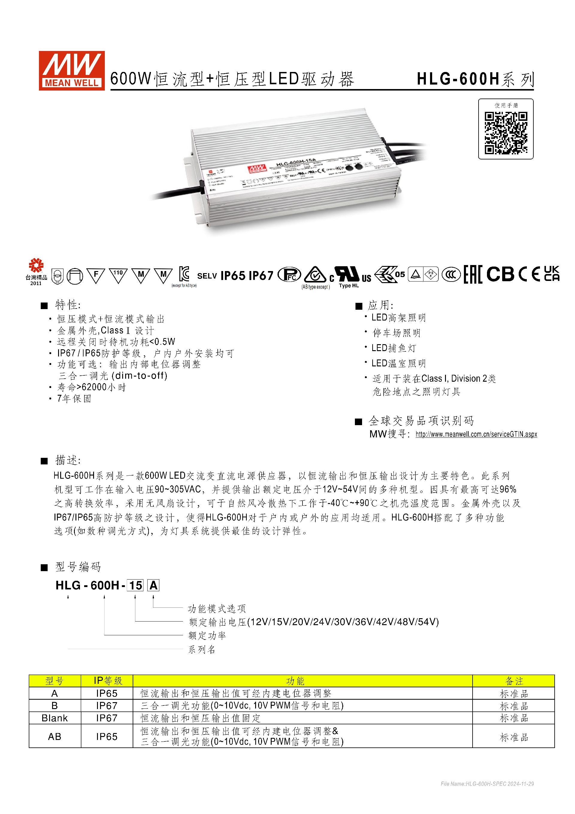 示例:HLG-600H-24A → 600W/24V 輸出 / A 型功能(IP65 + 電位器調(diào)節(jié));HLG-600H-48B → 600W/48V 輸出 / B 型功能(IP67 + 三合一調(diào)光)。