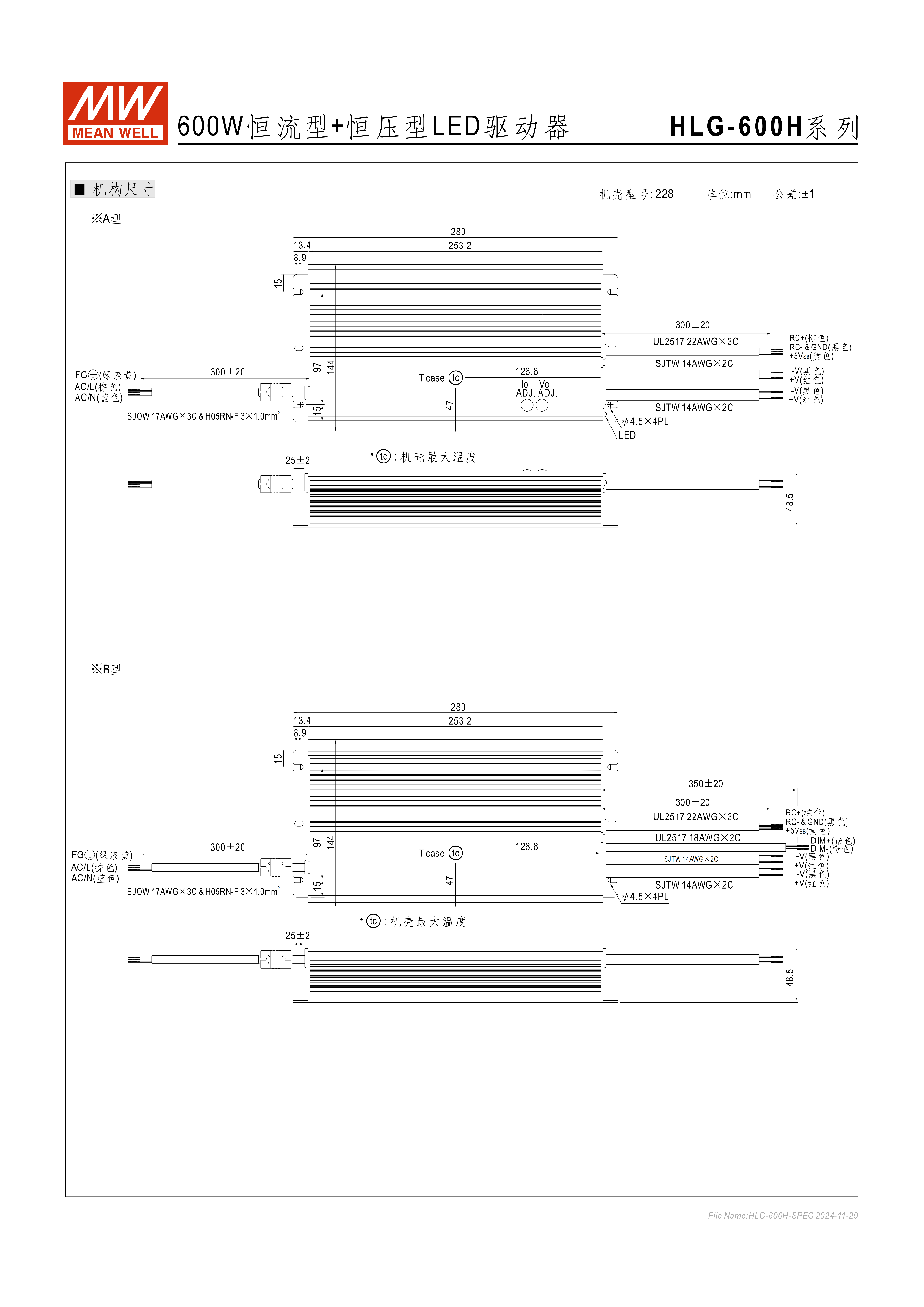 示例:HLG-600H-24A → 600W/24V 輸出 / A 型功能(IP65 + 電位器調(diào)節(jié));HLG-600H-48B → 600W/48V 輸出 / B 型功能(IP67 + 三合一調(diào)光)。