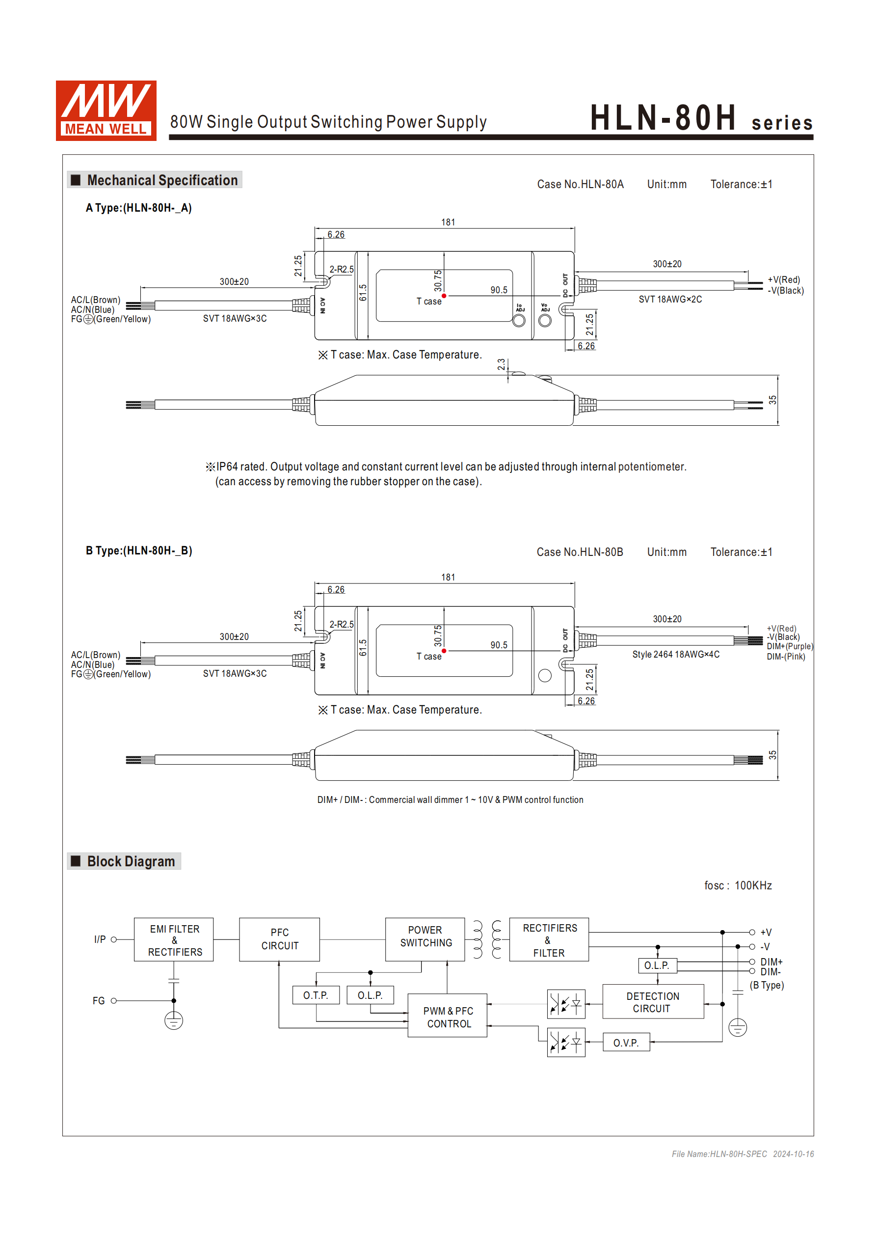 HLN-80H 系列是明緯推出的 80W 單組輸出開關(guān)電源,具備IP64 密封塑膠外殼、主動式 PFC功能,交流輸入范圍達90~305VAC,支持 **-40~+50℃寬溫工作,分A 型 **(內(nèi)部電位器調(diào)電壓 / 電流)和B 型(1~10Vdc/PWM/ 電阻調(diào)光),擁有短路 / 過流 / 過壓 / 過溫四重保護,Class 2 電源等級,符合全球照明安全規(guī)范,適配 LED 照明、工業(yè)照明等場景,提供3 年保固,MTBF 值最高達2786.8K hrs,效率最高91%。