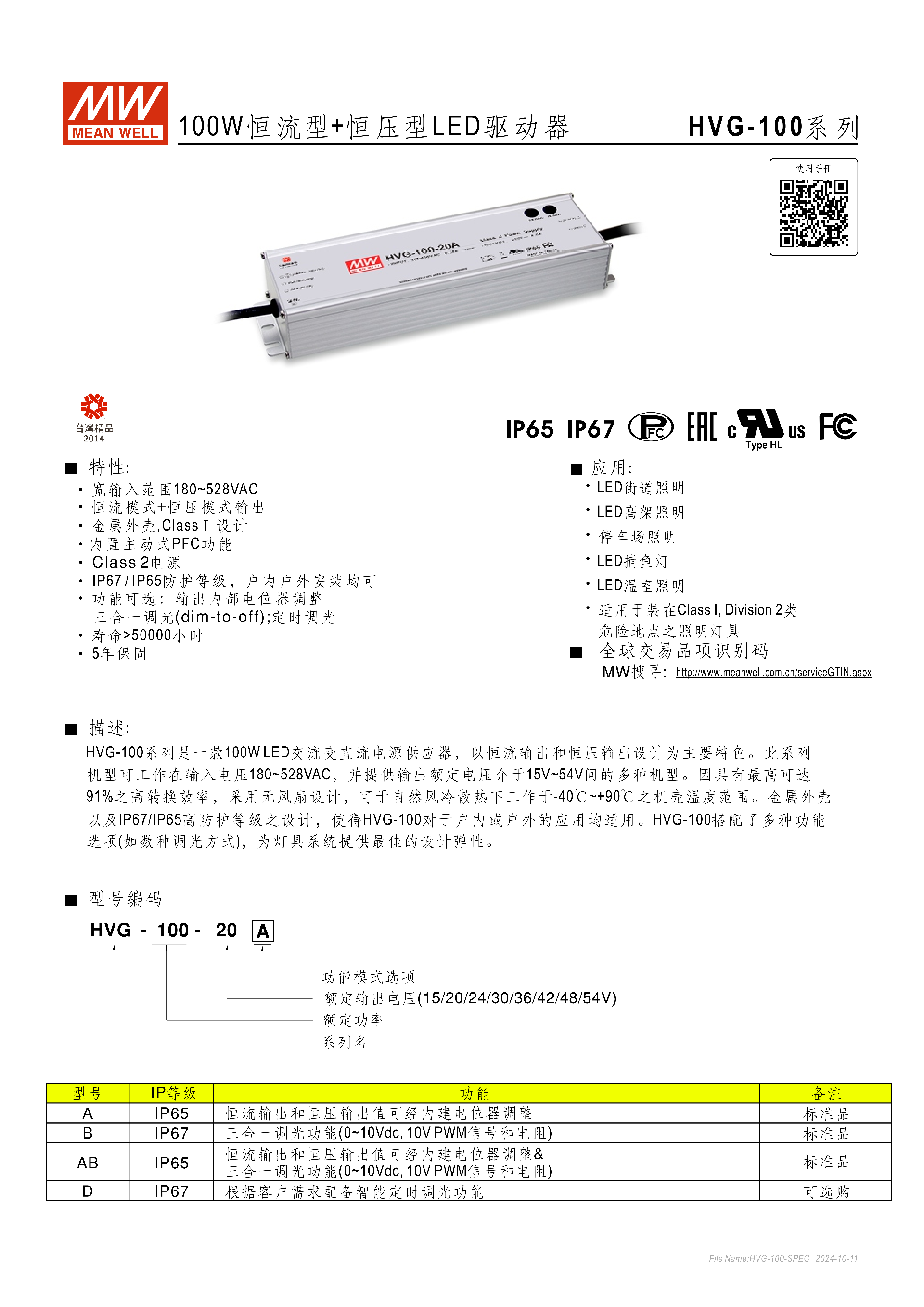 型號編碼規(guī)則:HVG-100-額定電壓-功能模式,其中額定電壓可選 15/20/24/30/36/42/48/54V,功能模式為核心區(qū)分維度,具體如下表:| 功能模式 | IP 等級 | 核心功能 | 產(chǎn)品類型 ||----------|--------|----------|----------|| A | IP65 | 內(nèi)置電位器調(diào)節(jié)恒流 / 恒壓輸出值 | 標(biāo)準(zhǔn)品 || B | IP67 | 三合一調(diào)光(0~10Vdc/10V PWM / 電阻) | 標(biāo)準(zhǔn)品 || AB | IP65 | 電位器調(diào)節(jié) + 三合一調(diào)光雙功能 | 標(biāo)準(zhǔn)品 || D | IP67 | 智能定時調(diào)光(按客戶需求配置) | 可選購 |