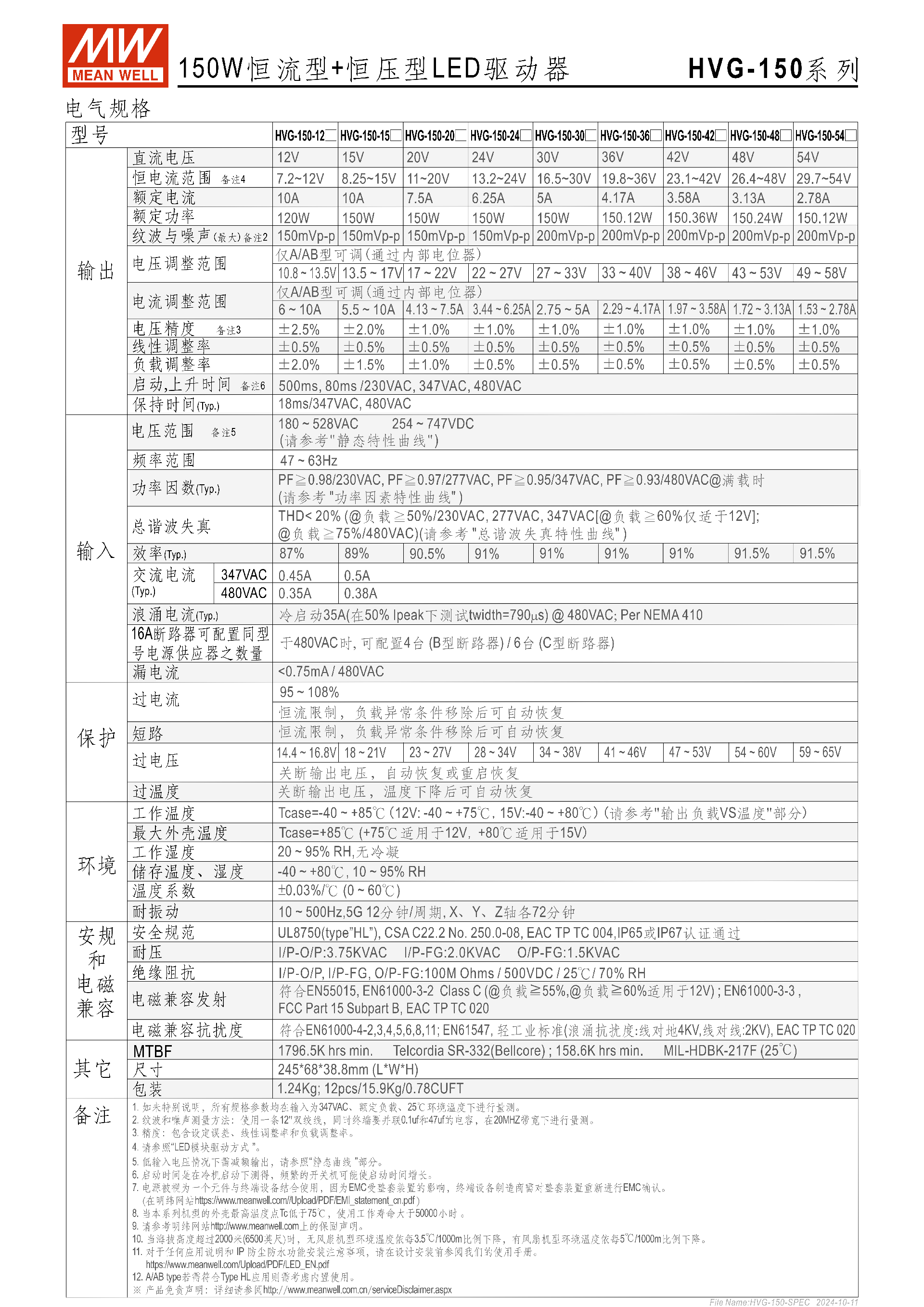 | HVG-150-54 | 54V | 2.78A | 29.7~54V | 200mVp-p | ±1.0% | 91.5% |