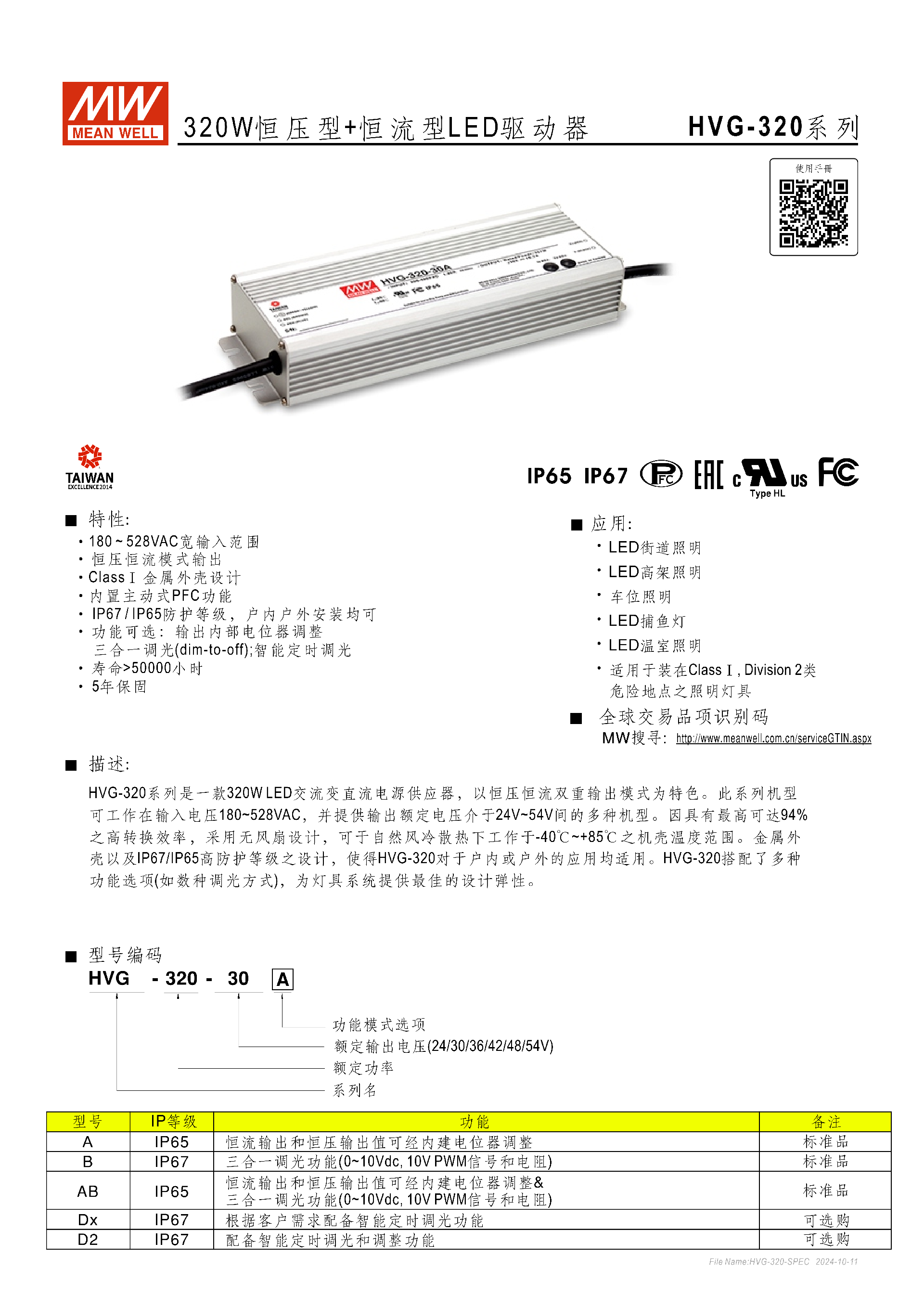 明緯HVG-320 系列是 320W 恒壓恒流雙模式 LED 驅(qū)動(dòng)器,具備180~528VAC寬輸入電壓范圍,輸出額定電壓涵蓋24V~54V多機(jī)型,擁有IP65/IP67防護(hù)等級(jí)、Class Ⅰ金屬外殼及內(nèi)置主動(dòng)式 PFC 功能,轉(zhuǎn)換效率最高達(dá)94%,無風(fēng)扇設(shè)計(jì)可在 **-40℃~+85℃機(jī)殼溫度工作,壽命超50000 小時(shí)且提供5 年 ** 保固;該系列分 A/B/AB/Dx/D2 等功能型號(hào),支持內(nèi)部電位器調(diào)節(jié)、三合一調(diào)光(0~10Vdc/10V PWM / 電阻)、智能定時(shí)調(diào)光等功能,過流 / 短路 / 過壓 / 過溫全保護(hù),適用于 LED 街道、高架、捕魚燈等戶內(nèi)戶外照明場(chǎng)景,還可用于 Class Ⅰ Division 2 類危險(xiǎn)地點(diǎn)。