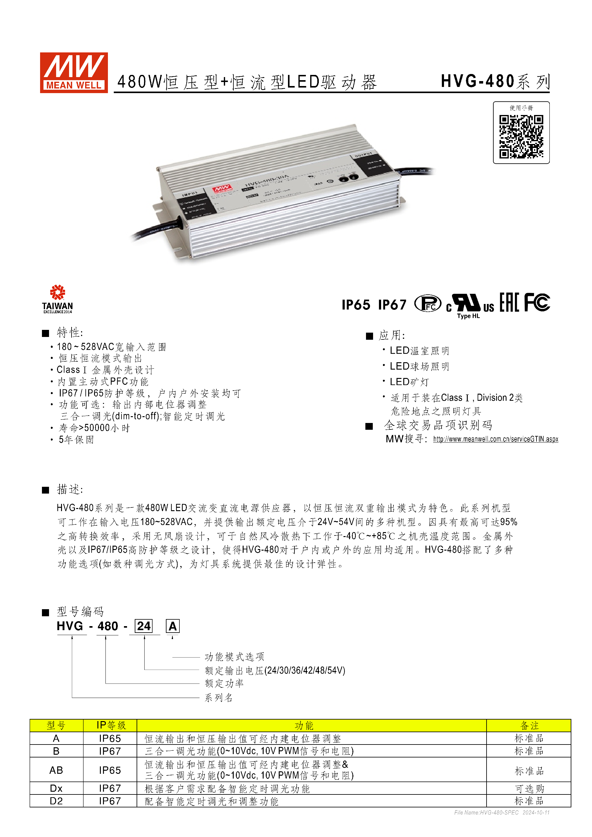 明緯HVG-480 系列為480W 恒壓 + 恒流雙模式LED 交流變直流驅(qū)動(dòng)器,是戶內(nèi)戶外通用型電源供應(yīng)器,主打?qū)掚妷狠斎?、高防護(hù)、高效率、長壽命,提供5 年保固,正常使用下壽命 **>50000 小時(shí) **(機(jī)殼溫度 < 80℃時(shí)),適用于多種 LED 照明場景及危險(xiǎn)地點(diǎn)照明。核心物理設(shè)計(jì):Class Ⅰ 金屬外殼,防護(hù)等級分IP65/IP67,無風(fēng)扇自然風(fēng)冷設(shè)計(jì),整機(jī)尺寸26212543.8mm(LWH),毛重約 2.8Kg,4 臺(tái)裝 12.2Kg/0.58CUFT。