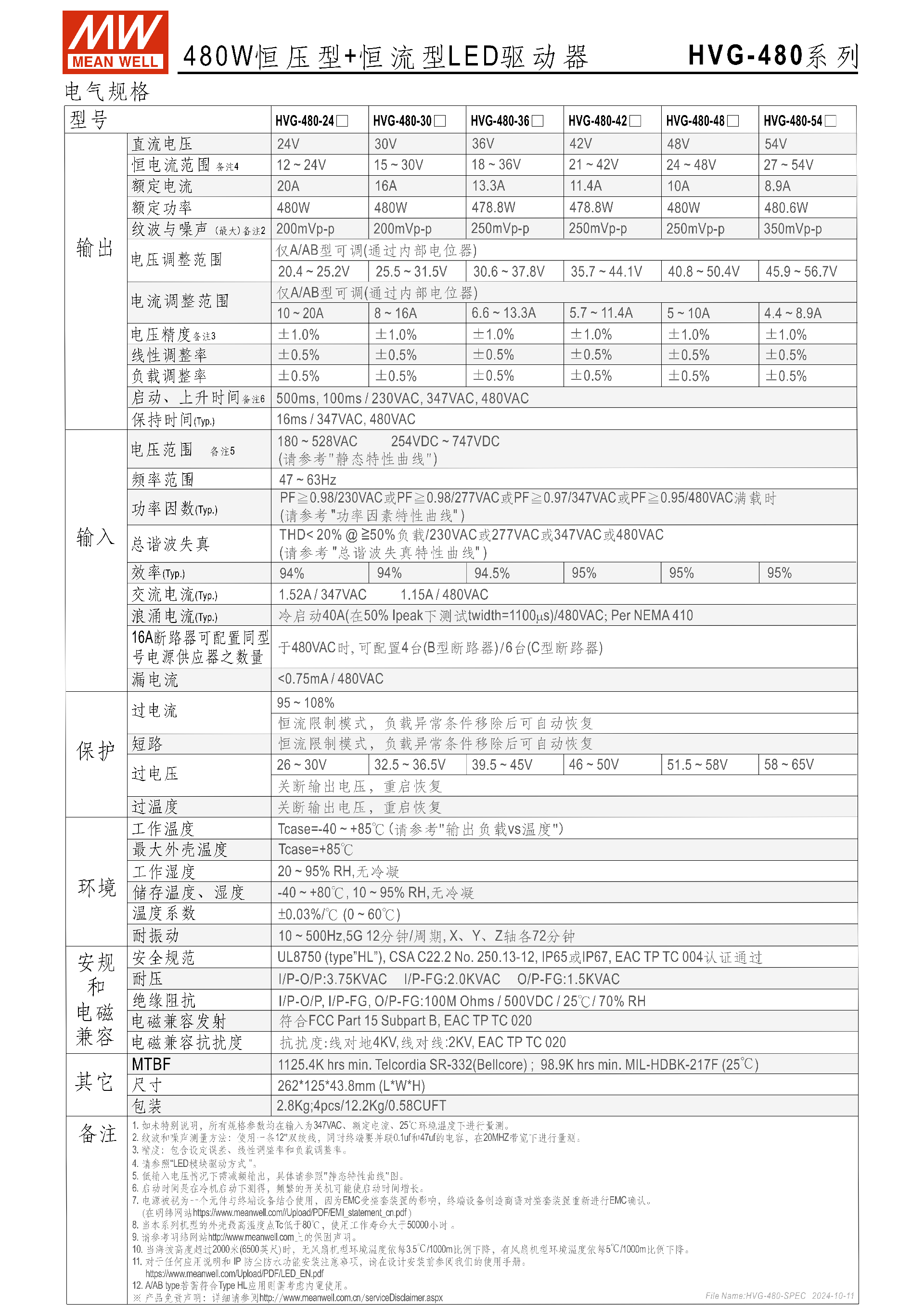 輸出規(guī)格系列分 6 款額定輸出電壓機(jī)型,核心參數(shù)如下表,A/AB 型支持電壓、電流電位器調(diào)節(jié),紋波與噪聲最大200~250mVp-p,轉(zhuǎn)換效率最高95%(54V/48V 機(jī)型)。| 型號(hào) | 額定輸出電壓 | 額定電流 | 額定功率 | 電壓調(diào)整范圍 | 電流調(diào)整范圍 | 紋波噪聲(max) ||--------------|--------------|----------|----------|--------------|--------------|-----------------|| HVG-480-24 | 24V | 20A | 480W | 20.4~25.2V | 10~20A | 200mVp-p || HVG-480-30 | 30V | 16A | 480W | 25.5~31.5V | 8~16A | 200mVp-p || HVG-480-36 | 36V | 13.3A | 478.8W | 30.6~37.8V | 6.6~13.3A | 250mVp-p || HVG-480-42 | 42V | 11.4A | 478.8W | 35.7~44.1V | 5.7~11.4A | 250mVp-p || HVG-480-48 | 48V | 10A | 480W | 40.8~50.4V | 5~10A | 250mVp-p || HVG-480-54 | 54V | 8.9A | 480.6W | 45.9~56.7V | 4.4~8.9A | 250mVp-p |