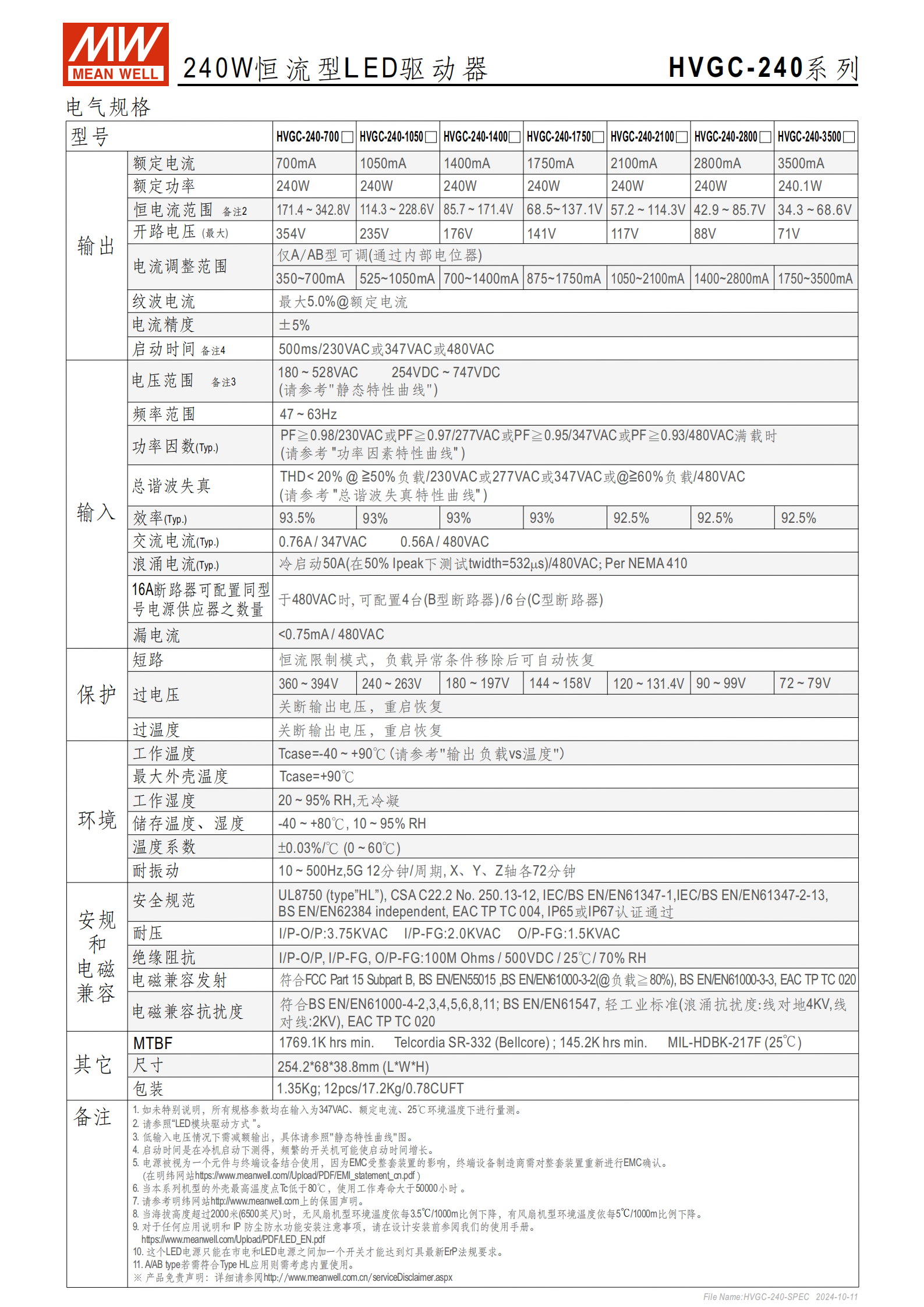 所有型號額定功率均為 240W(3500mA 款為 240.1W),輸入電壓統(tǒng)一為 180~528VAC/254~747VDC,以下為各型號核心輸出參數(shù):