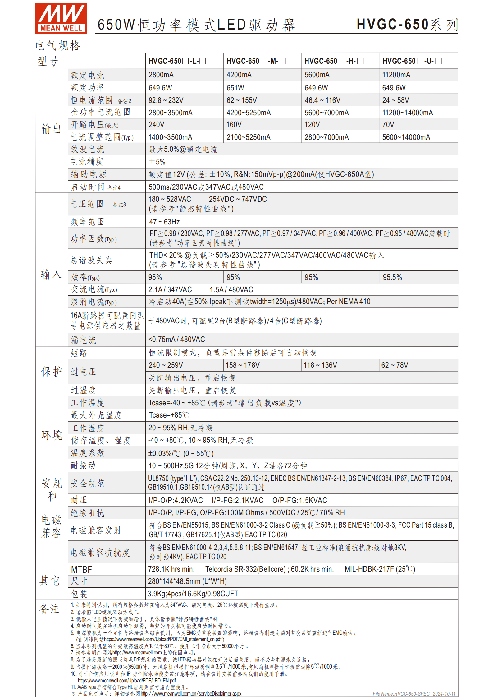 編碼規(guī)則:HVGC-1000-【額定電流】-【功能模式】,其中額定電流 L=2800mA、M=4200mA、H=5600mA;功能模式分 4 類,均為 IP67 等級,具體如下:| 功能模式 | 核心功能 | 產(chǎn)品屬性 ||----------|----------|----------|| AB | 標(biāo)準(zhǔn)恒功率 + 三合一調(diào)光(0~10Vdc/10VPWM / 電阻)+ 內(nèi)置電位器 | 標(biāo)準(zhǔn)品 || D2 | 智能定時(shí)調(diào)光 | 可選購 || Dx | 客戶定制化智能定時(shí)調(diào)光 | 可選購 || DA | DALI-2 控制 + 恒流輸出 + 內(nèi)置電位器調(diào)額定值 | 可選購 |