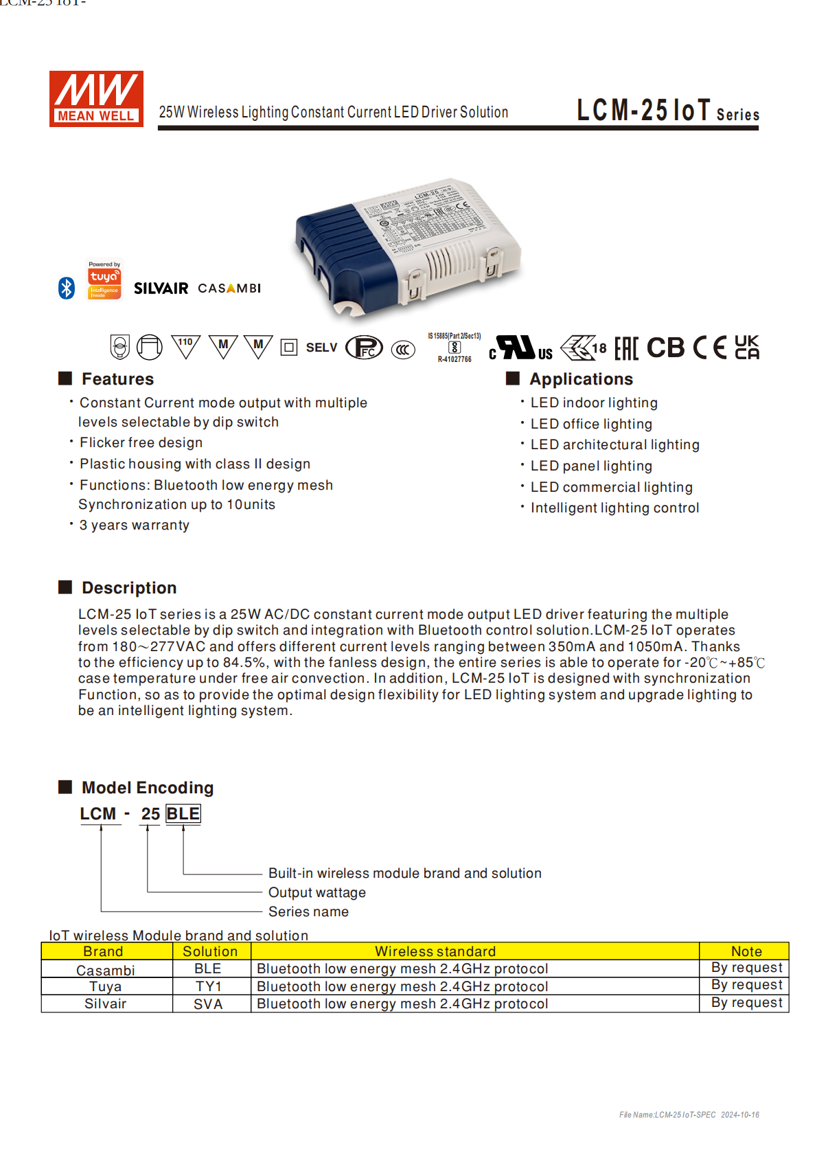 明緯 LCM-25 IoT 系列是 25W 交流變直流恒流型 LED 驅(qū)動器,集成低能耗藍(lán)牙 2.4GHz 通訊,輸入電壓覆蓋 180~277VAC,輸出電流可通過 DIP 開關(guān)在350mA~1050mA間六檔調(diào)節(jié),默認(rèn) 700mA,轉(zhuǎn)換效率最高達(dá)84.5%,支持10 臺設(shè)備同步操作(1 主 9 輔),調(diào)光范圍 0~100%(最低 6%),具備短路、過溫等多重保護(hù),工作溫度為機(jī)殼 - 20℃~+85℃,塑膠外殼 Class Ⅱ 設(shè)計,適配 Casambi、Tuya、Silvair 等多種藍(lán)牙解決方案,適用于各類 LED 智能照明場景,提供 3 年保固。