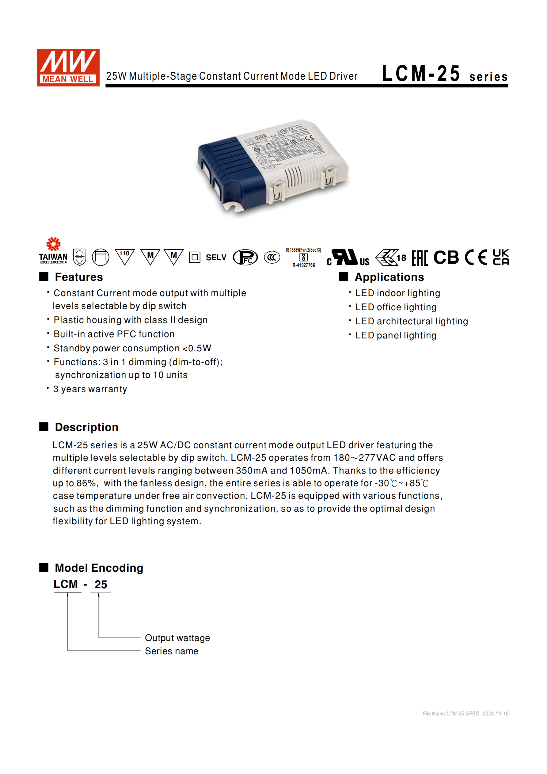 明緯LCM-25 系列是 25W 多級輸出恒流型 LED 驅動器,采用塑膠外殼 Class Ⅱ 設計,輸入電壓覆蓋180~277VAC,可通過 DIP 開關選擇350mA~1050mA六檔輸出電流,直流電壓范圍隨電流不同為 6~54V 至 6~24V,內置主動式 PFC功能,擁有三合一調光和最多10 臺同步的功能,待機功耗 **<0.5W**,轉換效率最高86%,無風扇設計可在 **-30℃~+85℃** 機殼溫度下自然風冷工作,具備短路、過溫保護且可自動恢復,通過多項安規(guī)認證,提供 3 年保固,適用于各類 LED 室內、辦公、建筑及板燈照明場景。