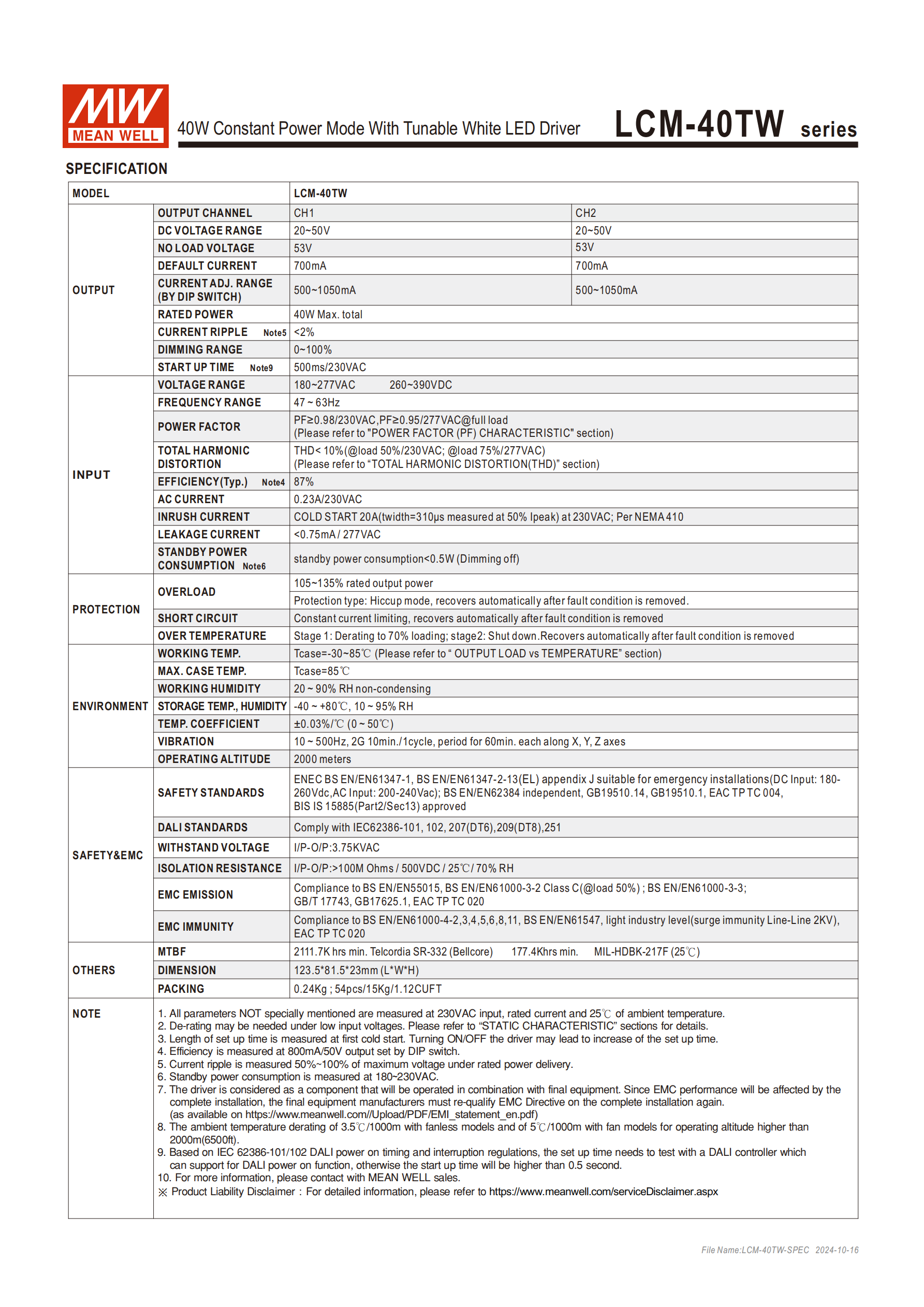 明緯 LCM-40TW 系列是40W 恒功率可調(diào)色溫 LED 驅(qū)動(dòng)器,支持DALI-2 DT6/DT8色溫與亮度控制,采用雙通道恒功率輸出模式,輸入電壓覆蓋180~277VAC/260~390VDC,輸出電流可通過撥碼開關(guān)在500~1050mA調(diào)節(jié),具備無頻閃(符合 IEEE1789)、高 PF(≥0.95)、低待機(jī)功耗(<0.5W) 等特性,工作溫度達(dá) **-30℃~+85℃,擁有過載、短路、過溫多重保護(hù),適配可調(diào)色溫照明、商業(yè)照明等場景,提供5 年保固 **,還可通過按鍵或 DALI 協(xié)議實(shí)現(xiàn)調(diào)光調(diào)色溫,設(shè)計(jì)彈性優(yōu)異。