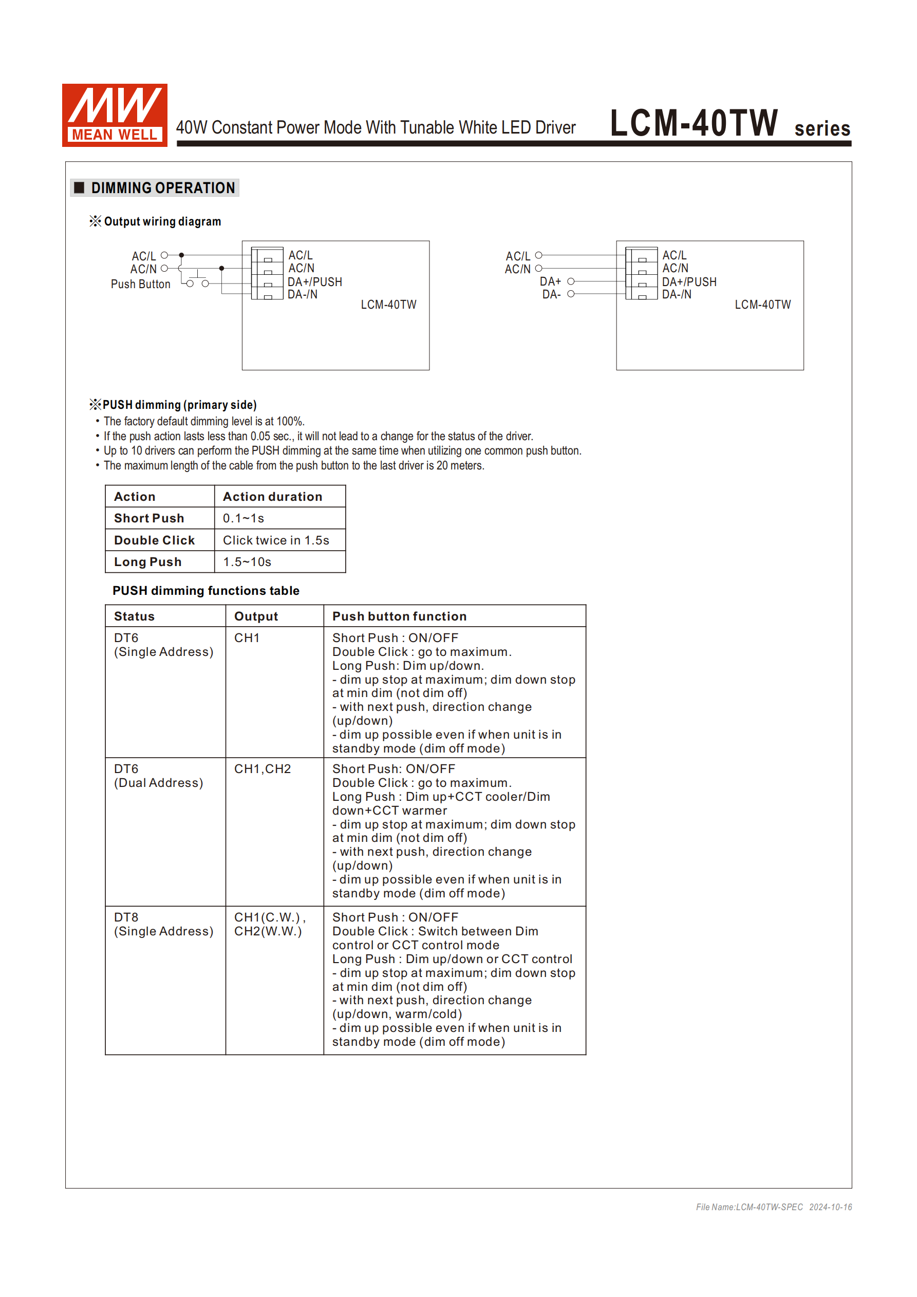 LCM-40TW 是明緯推出的40W 恒功率可調(diào)色溫 LED 驅(qū)動(dòng)器,基于 DALI-2 DT8 可調(diào)色溫設(shè)計(jì),也兼容 DT6 獨(dú)立雙通道應(yīng)用,采用雙通道恒功率輸出模式,可實(shí)現(xiàn)亮度與色溫的靈活調(diào)節(jié),適配各類 LED 照明系統(tǒng),支持應(yīng)急照明(EL)應(yīng)用,提供5 年保固。