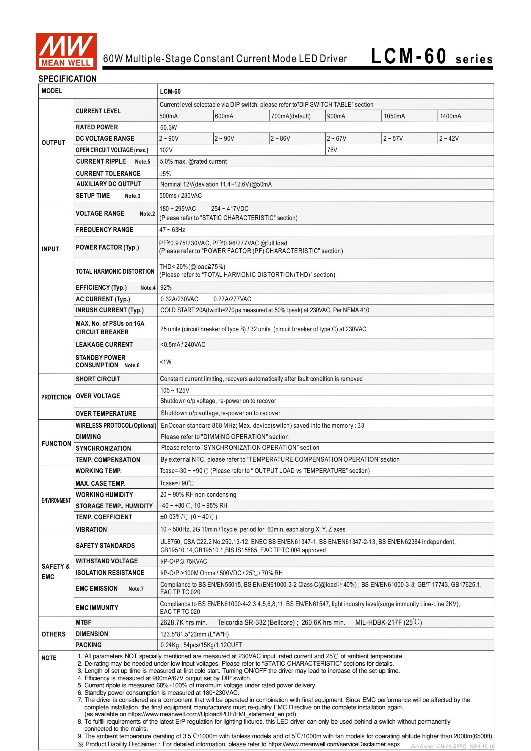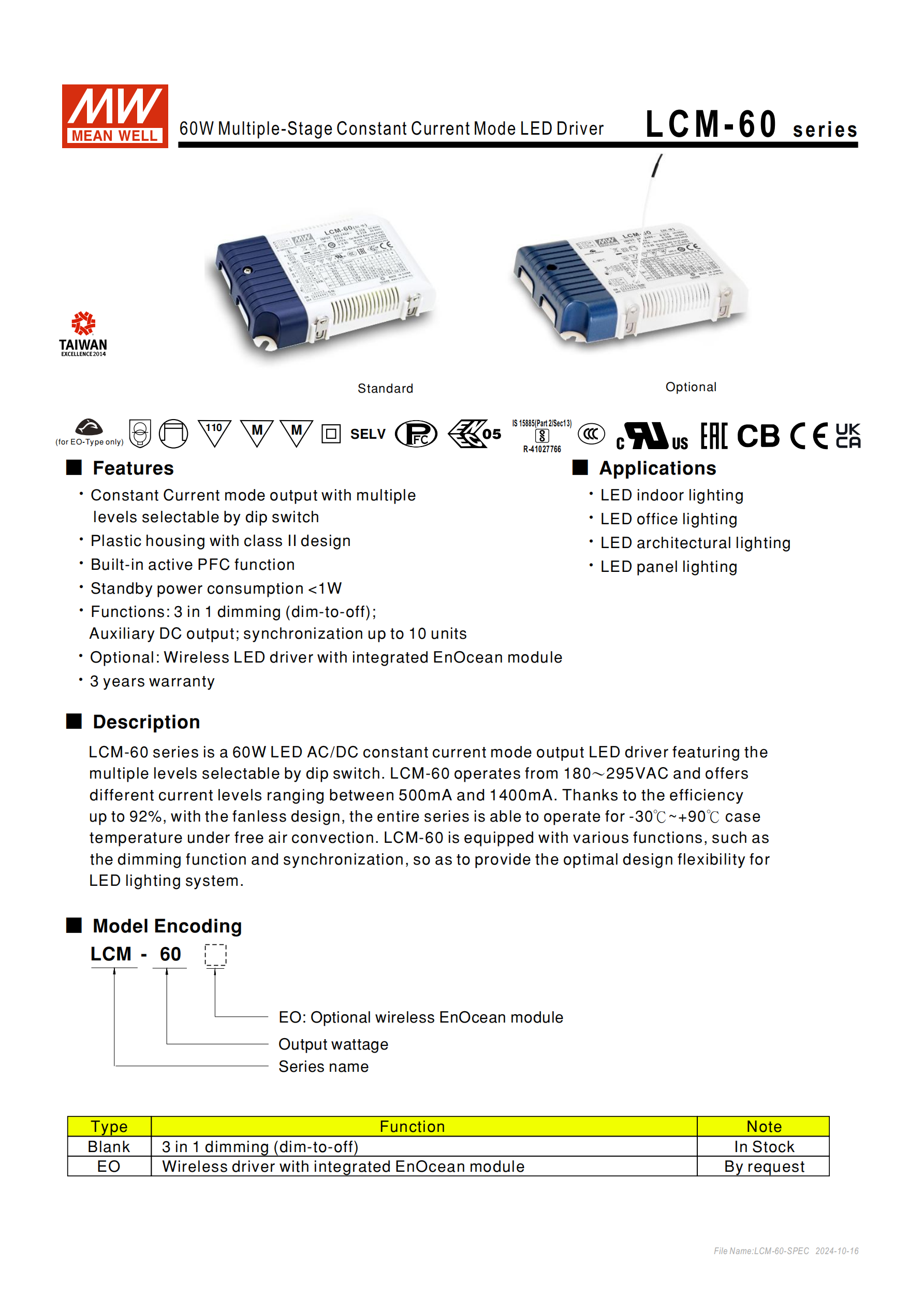 明緯LCM-60 系列是 60W 交流變直流恒流型 LED 驅(qū)動器,輸入電壓覆蓋180~295VAC,輸出電流可通過 DIP 開關(guān)在500mA~1400mA間多檔位選擇,標(biāo)配三合一調(diào)光、10 臺同步、溫度補償及12V 輔助直流輸出功能,可選易能森 EnOcean 無線通訊模塊(EO 型),具備主動式 PFC、待機功耗 **<1W**、轉(zhuǎn)換效率最高92% 等特性,采用塑膠外殼 Class II 設(shè)計,無風(fēng)扇自然風(fēng)冷,工作溫度 **-30℃~+90℃**,通過多項國際安規(guī)認證,提供 3 年保固,主要應(yīng)用于 LED 室內(nèi)、辦公、建筑及板燈照明場景。