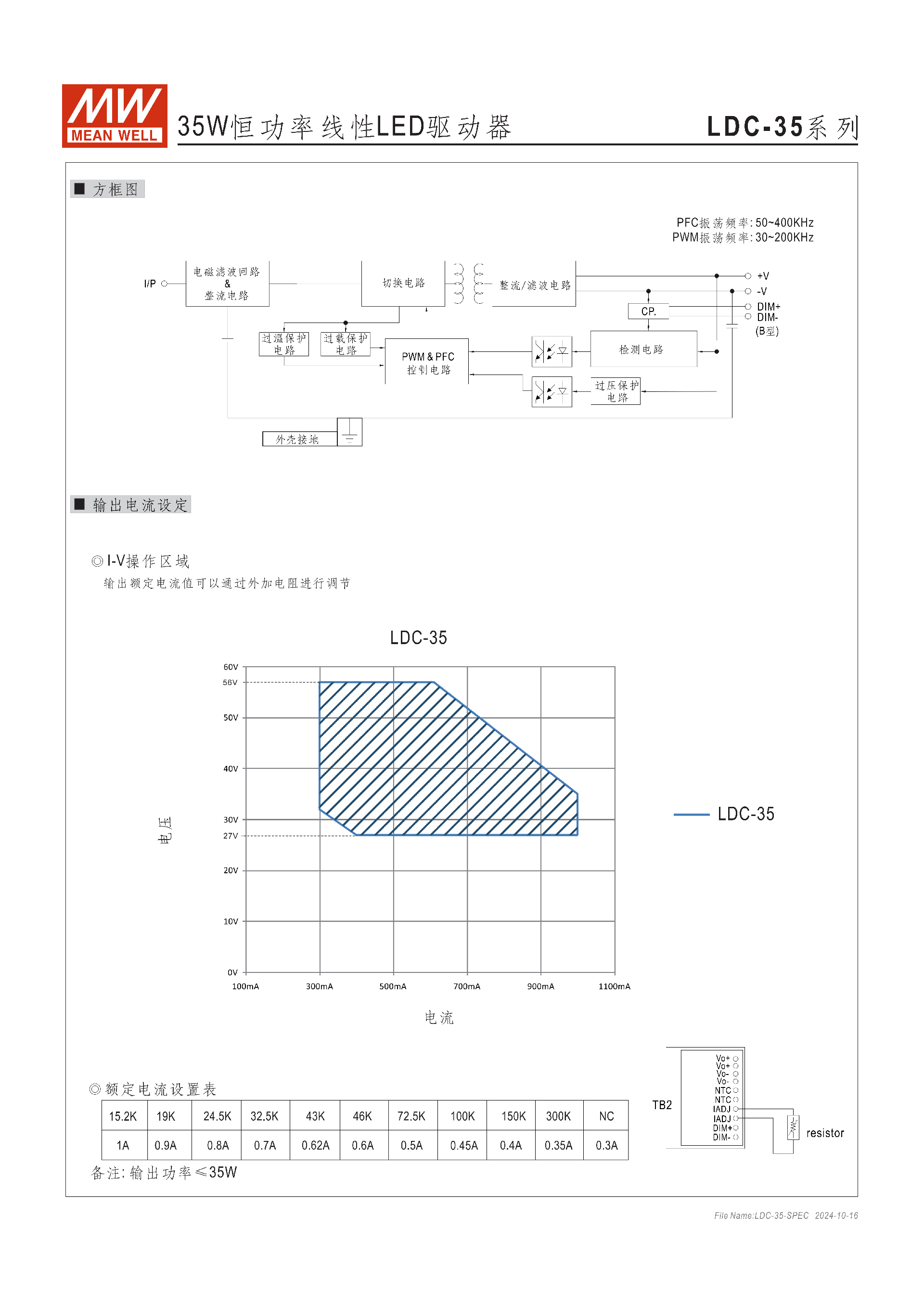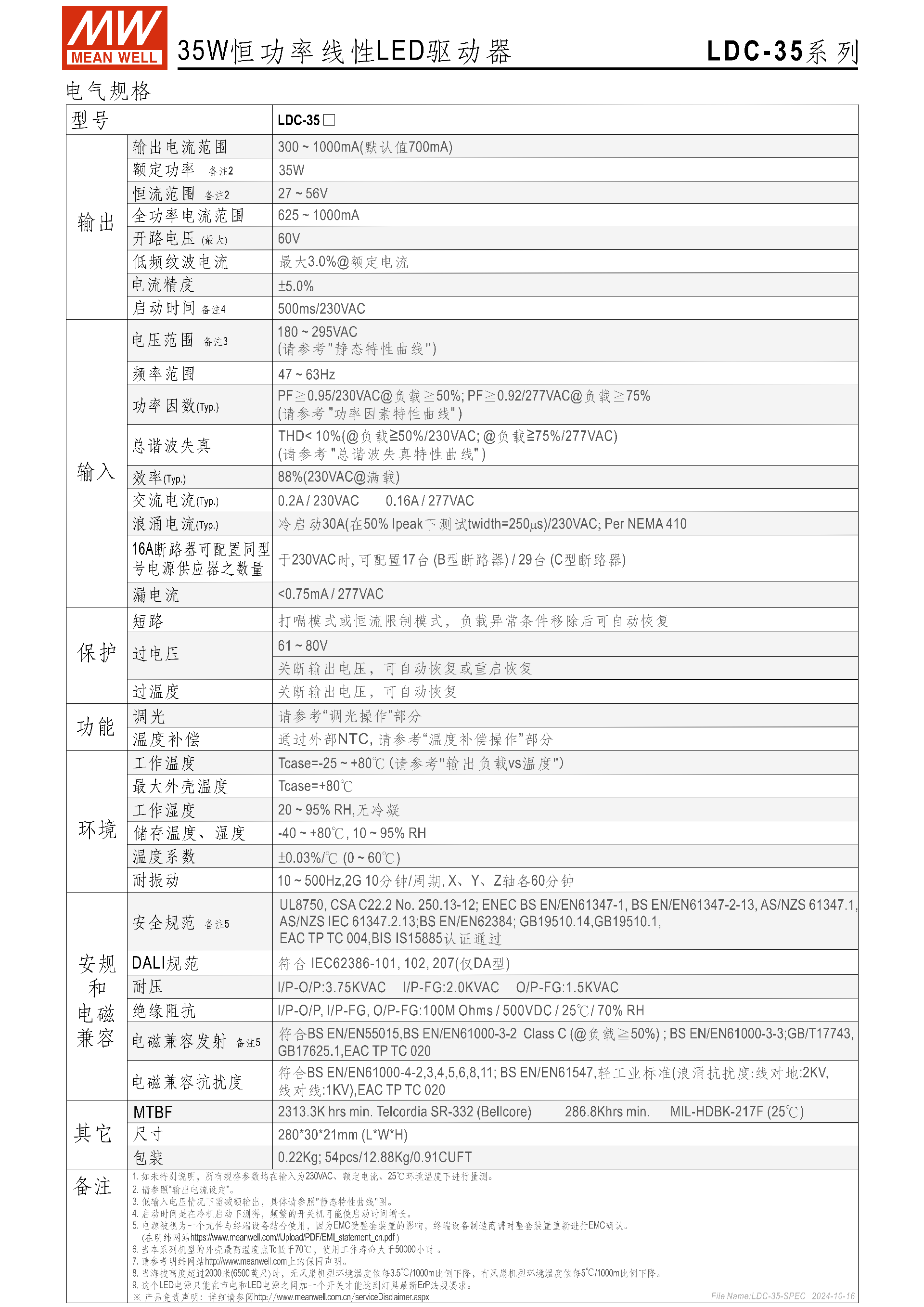 | 額定功率 | 35W,全功率電流范圍 625~1000mA | |