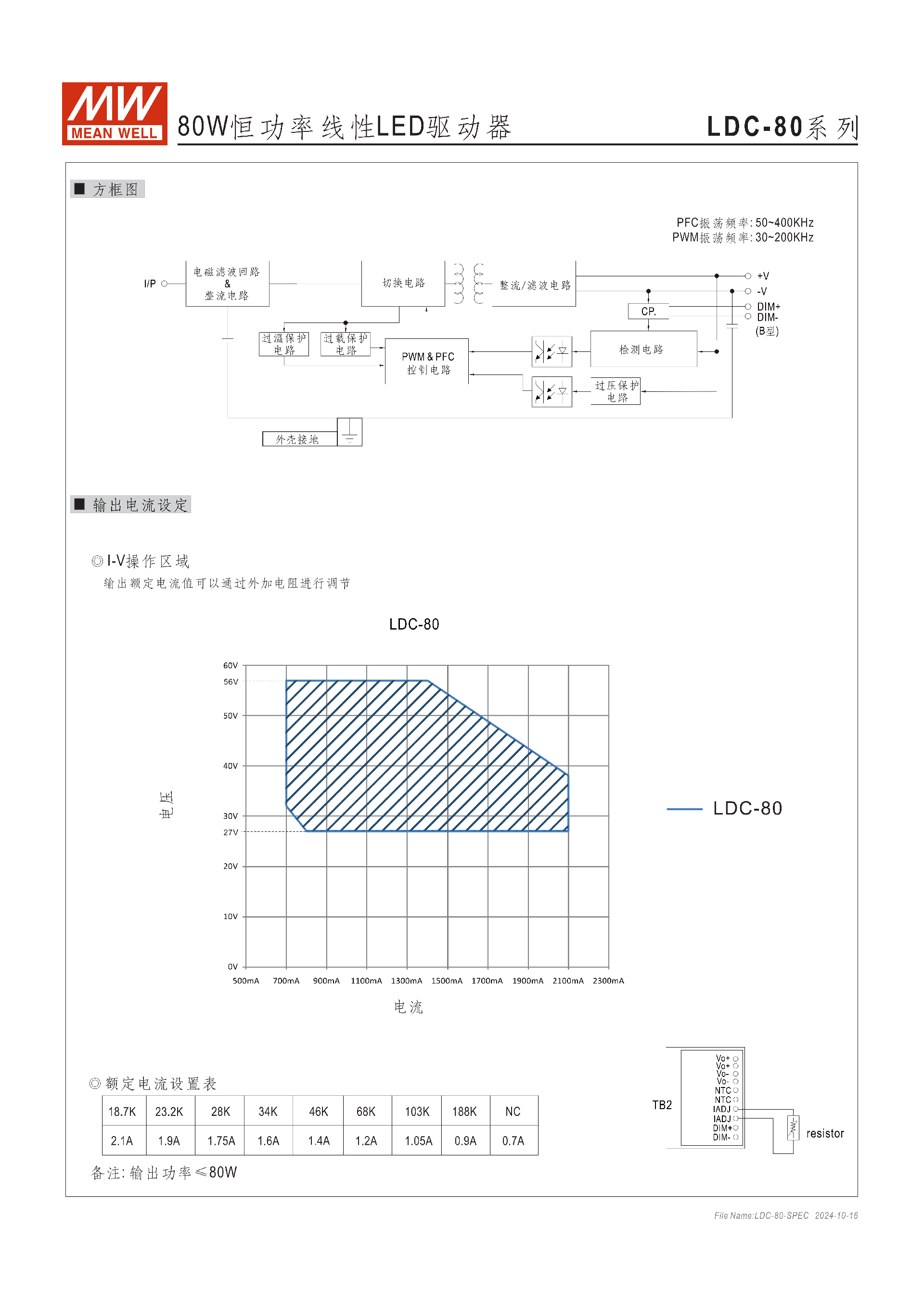 可通過外接電阻調(diào)節(jié)輸出額定電流,電阻與對(duì)應(yīng)電流值如下(輸出功率≤80W):