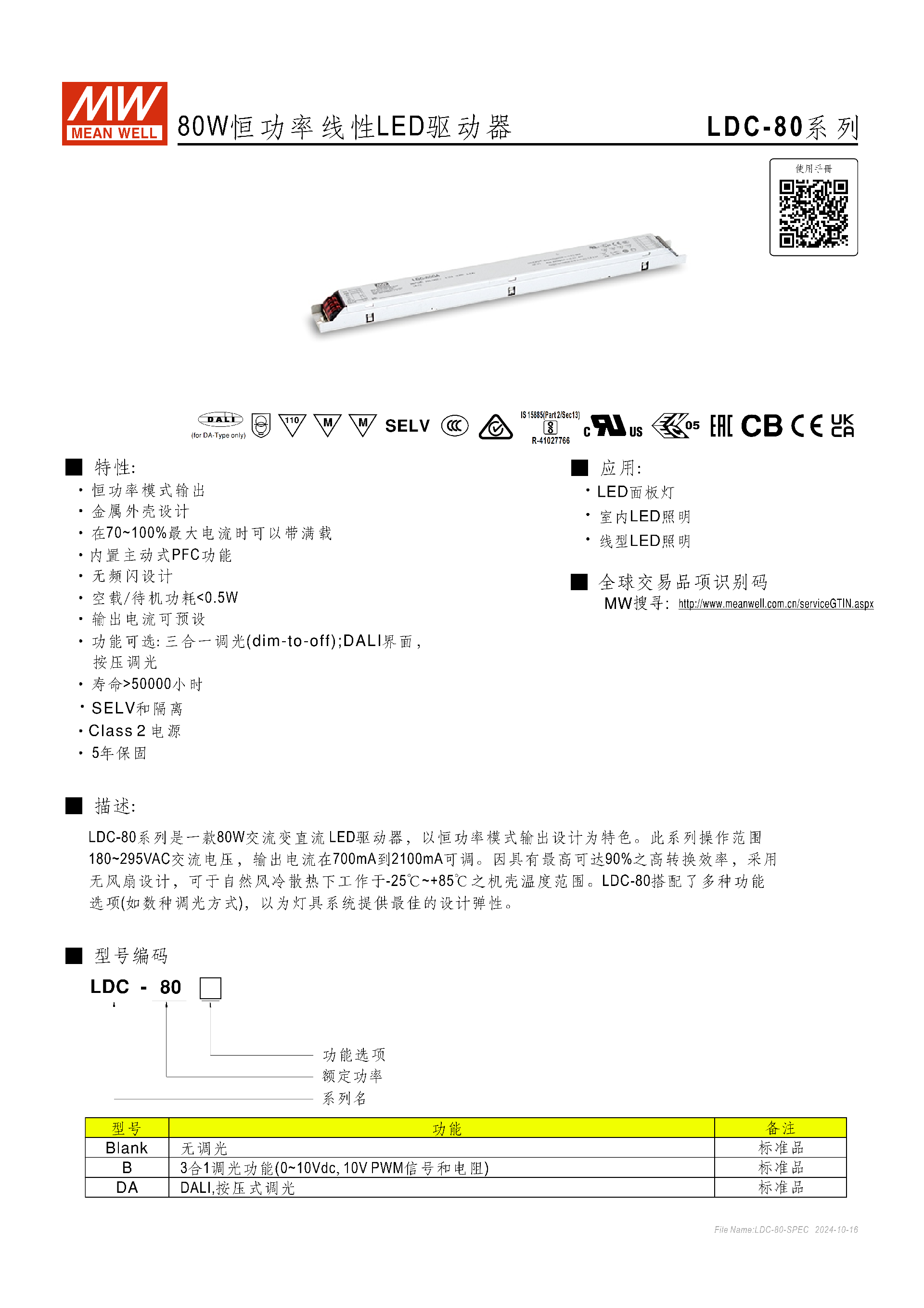 明緯LDC-80 系列為 80W 恒功率線性 LED 驅(qū)動(dòng)器,采用金屬外殼設(shè)計(jì),輸入電壓范圍180~295VAC,輸出電流700~2100mA(默認(rèn) 1400mA)、恒流電壓范圍27~56V,轉(zhuǎn)換效率達(dá)90%,具備主動(dòng)式 PFC、無頻閃、空載 / 待機(jī)功耗 < 0.5W等特性,提供無調(diào)光、3 合 1 調(diào)光(B 型)、DALI + 按壓調(diào)光(DA 型)三種功能版本,支持輸出電流預(yù)設(shè)、外部 NTC 溫度補(bǔ)償,工作溫度為 **-25℃~+85℃機(jī)殼溫度,擁有短路 / 過壓 / 過溫保護(hù),安規(guī)認(rèn)證齊全,壽命超50000 小時(shí)且提供5 年保固 **,適用于 LED 面板燈、室內(nèi)及線型 LED 照明場景。
