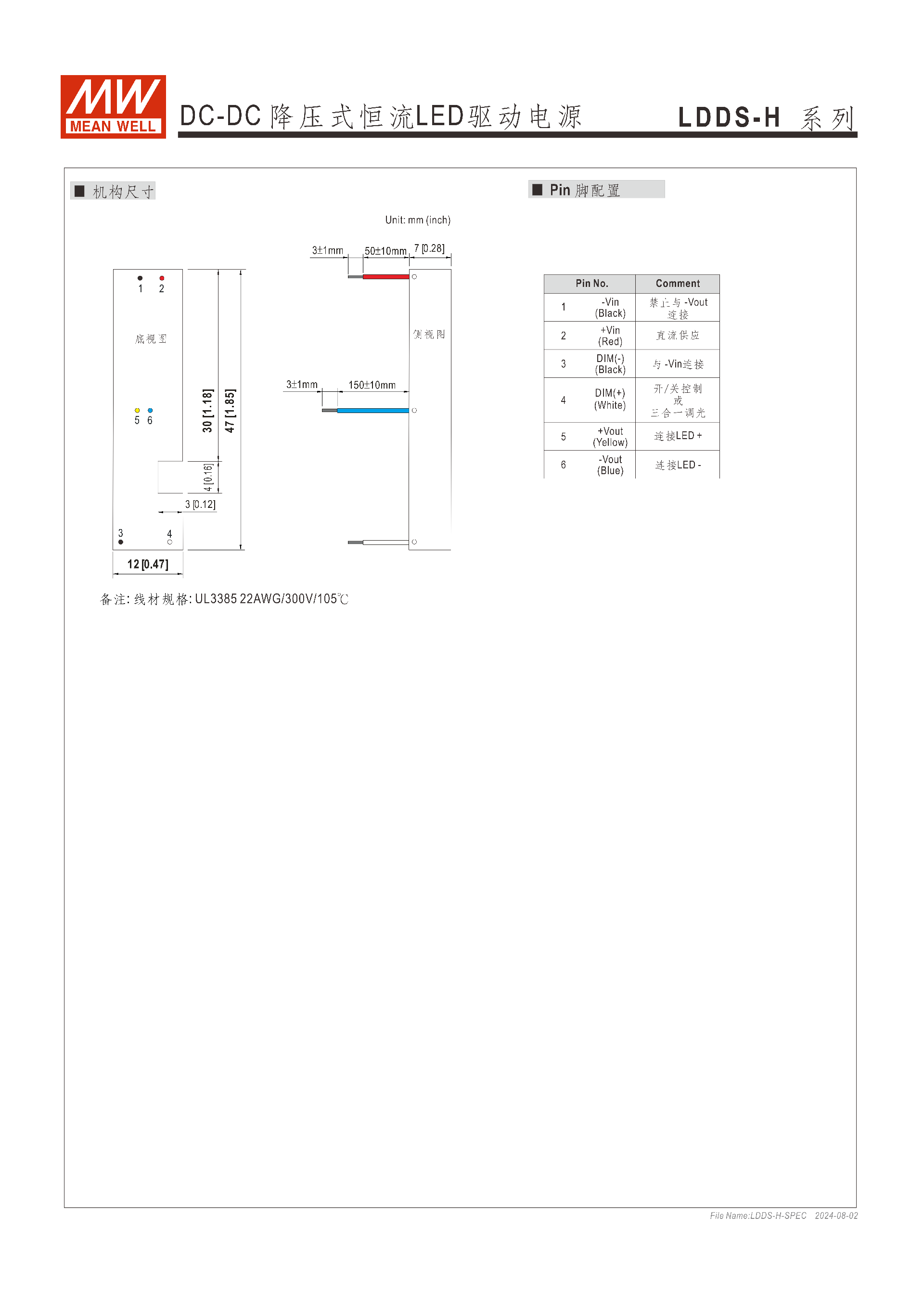 線材:規(guī)格為UL3385 22AWG/300V/105℃,Pin 腳共 6 路,明確區(qū)分正負(fù)極、調(diào)光端、LED 輸出端,禁止 - Vout 與其他非對應(yīng)引腳連接。
