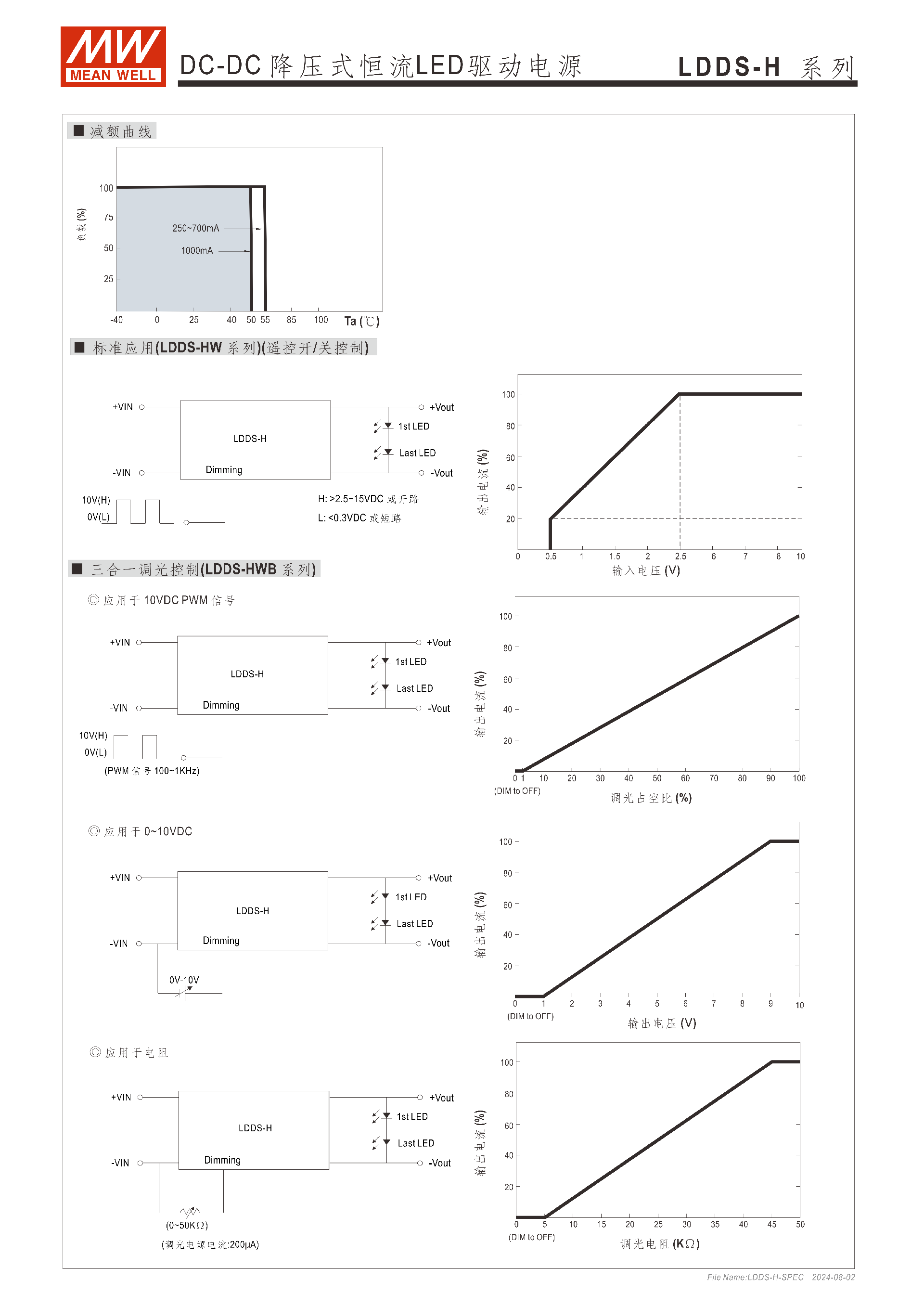 | LDDS-700HW | 700mA | 2~45VDC | ±5% | 350mVp-p | 94% | 200mA |
