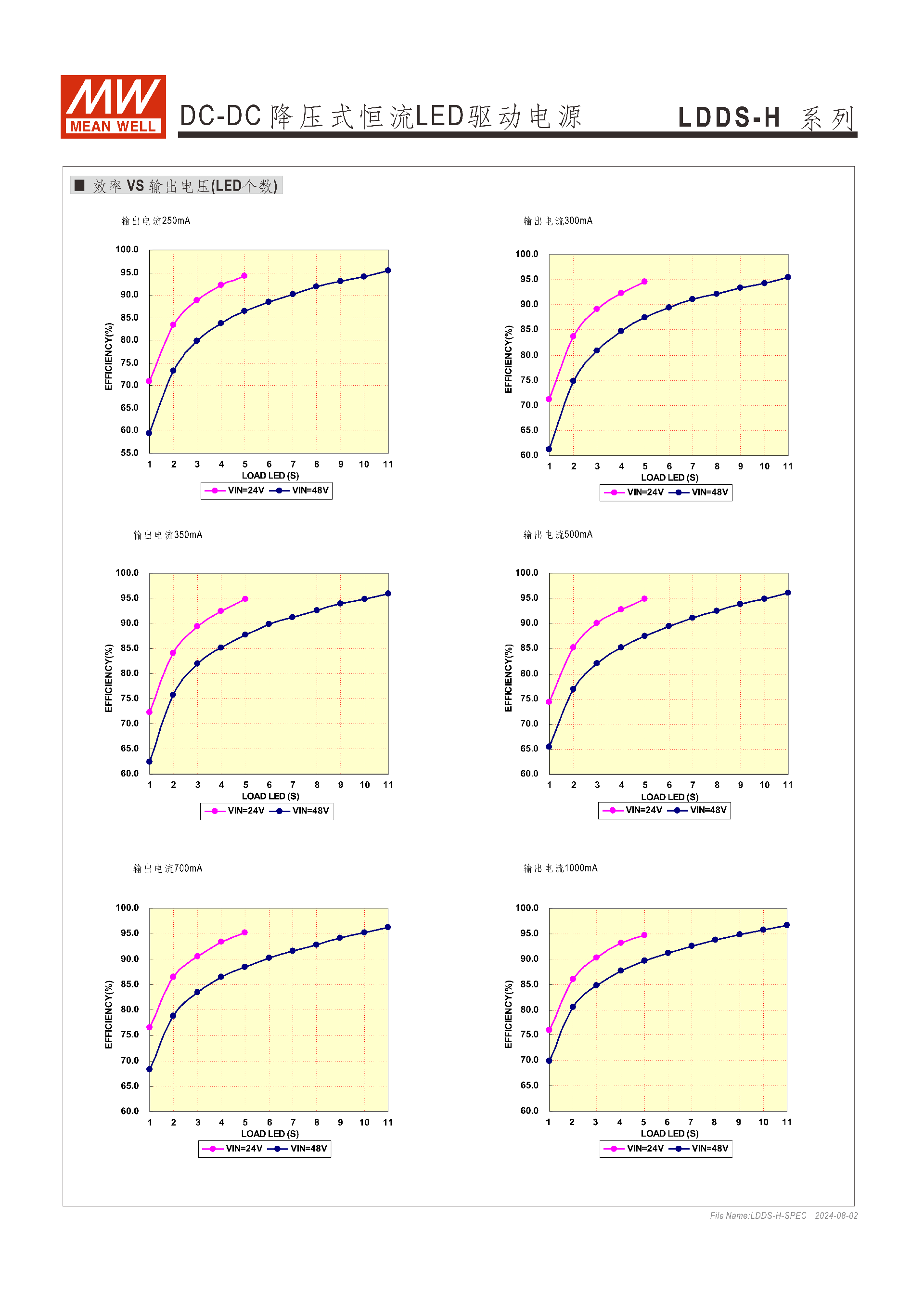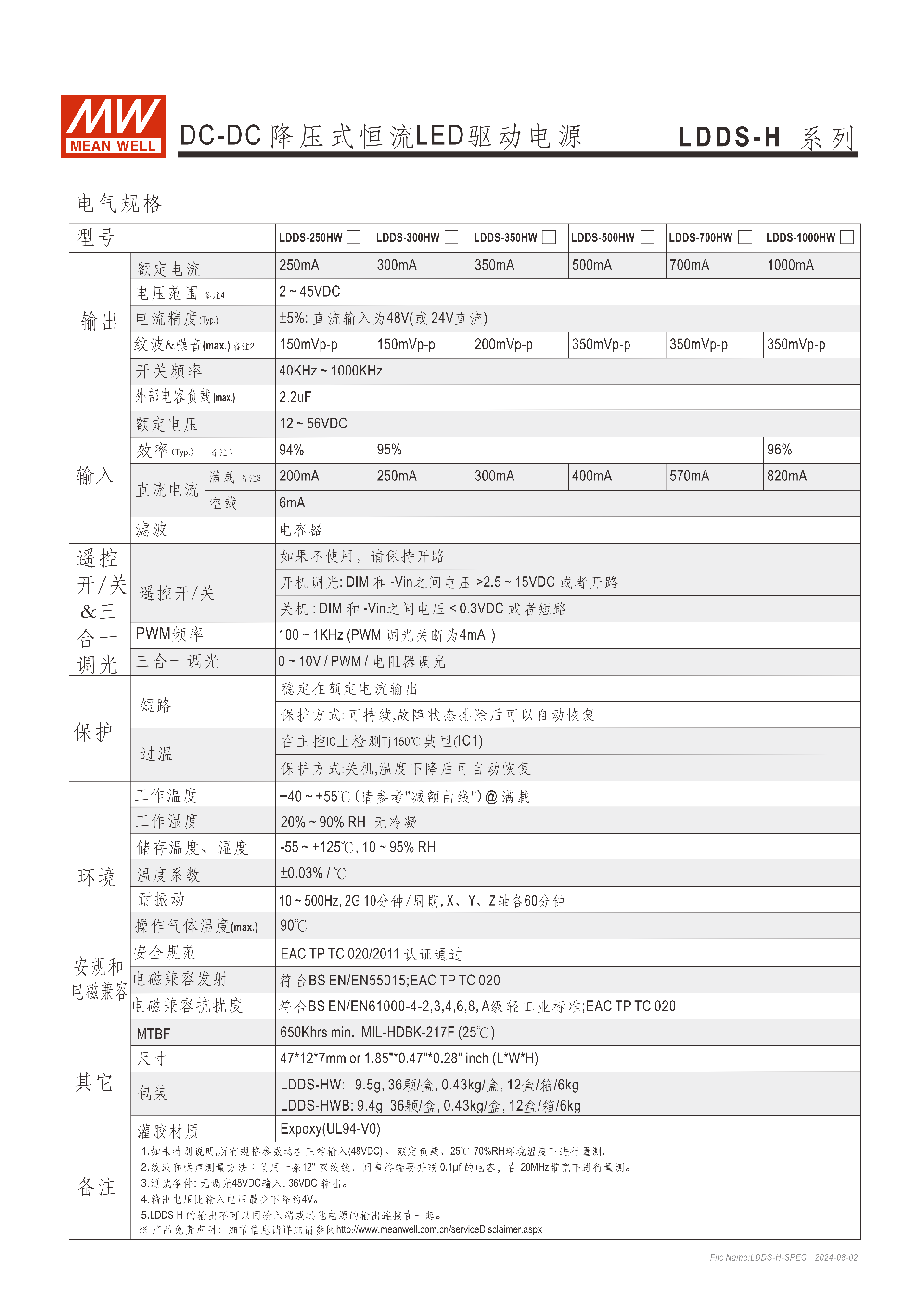 | LDDS-1000HW | 1000mA | 2~45VDC | ±5% | 350mVp-p | 94% | 570mA |