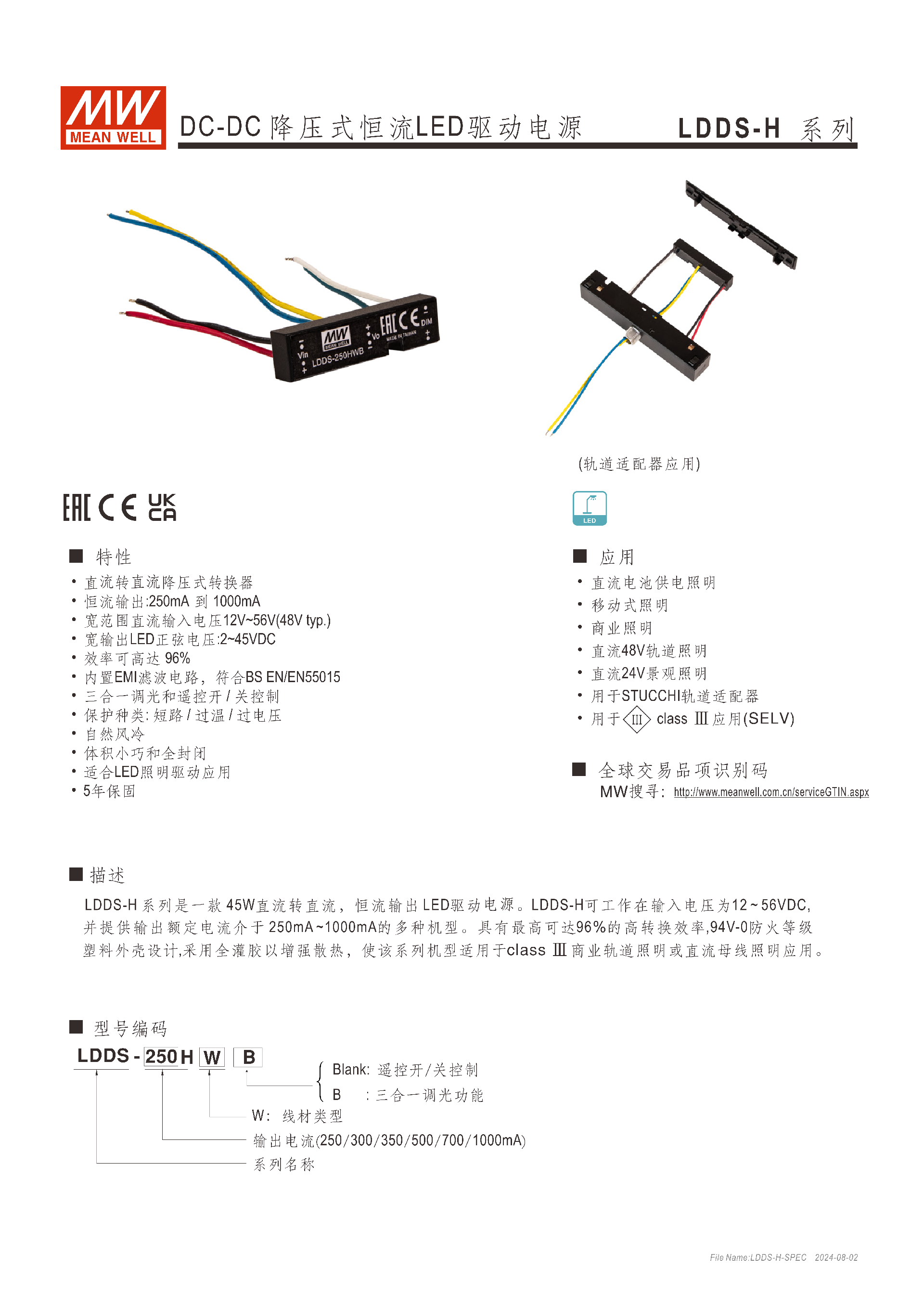 明緯 LDDS-H 系列是45W 直流轉(zhuǎn)直流降壓式恒流 LED 驅(qū)動電源,輸入電壓寬至12~56VDC,輸出電流涵蓋250mA~1000mA、輸出電壓2~45VDC,最高轉(zhuǎn)換效率達(dá)96%,分 HW(遙控開 / 關(guān))和 HWB(三合一調(diào)光)兩款,具備短路、過溫、過壓全保護(hù),采用 UL94-V0 灌膠外殼,自然風(fēng)冷且體積小巧(47127mm),適配直流電池 / 軌道 / 景觀等 LED 照明,符合多項(xiàng) EMC 和安全規(guī)范,享有5 年保固,MTBF 最低達(dá) 650Khrs。