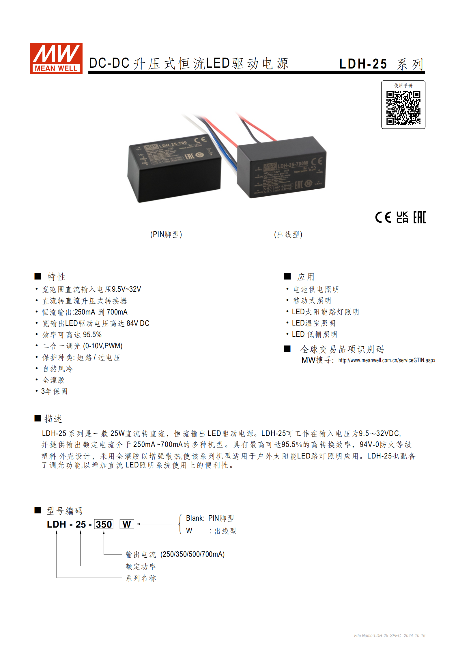 明緯 LDH-25 系列是 DC-DC 升壓式恒流 LED 驅(qū)動(dòng)電源,輸入電壓覆蓋9.5V~32VDC,提供250/350/500/700mA四檔恒流輸出,最高輸出電壓達(dá)84VDC、轉(zhuǎn)換效率至95.5%,支持0-10V 直流 + 1KHz-3KHz 10V PWM二合一調(diào)光,具備短路、過(guò)電壓保護(hù),采用全灌膠、自然風(fēng)冷設(shè)計(jì),防護(hù)性優(yōu)異,適配電池供電、太陽(yáng)能路燈、溫室照明等移動(dòng)式 / 戶外 LED 照明場(chǎng)景,擁有 3 年保固,同時(shí) PIN 腳型和出線型兩種結(jié)構(gòu)可選,電氣與機(jī)械規(guī)格完善,應(yīng)用需遵循特定接線和 EMC 要求。