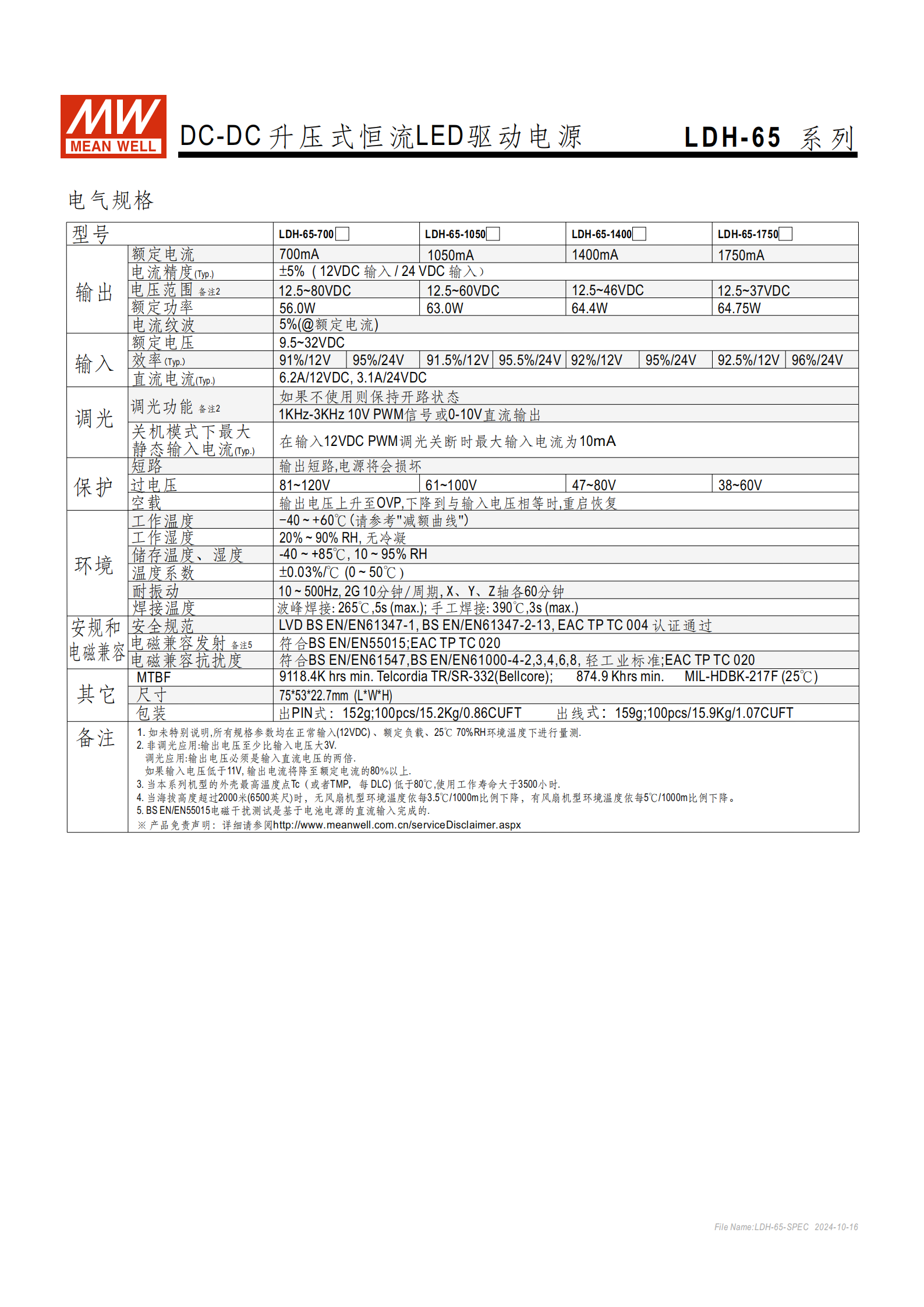 輸出參數(shù):恒流輸出分四檔機型,輸出電壓范圍隨電流檔位不同調(diào)整,核心參數(shù)如下表:| 型號 | 額定恒流 | 輸出電壓范圍 | 額定功率 | 電流精度 | 電流紋波 ||------|----------|--------------|----------|----------|----------|| LDH-65-700 | 700mA | 12.5~80VDC | 56.0W/63.0W | ±5% | 5%@額定電流 || LDH-65-1050 | 1050mA | 12.5~60VDC | - | ±5% | 5%@額定電流 || LDH-65-1400 | 1400mA | 12.5~46VDC | 64.4W | ±5% | 5%@額定電流 || LDH-65-1750 | 1750mA | 12.5~37VDC | 64.75W | ±5% | 5%@額定電流 |