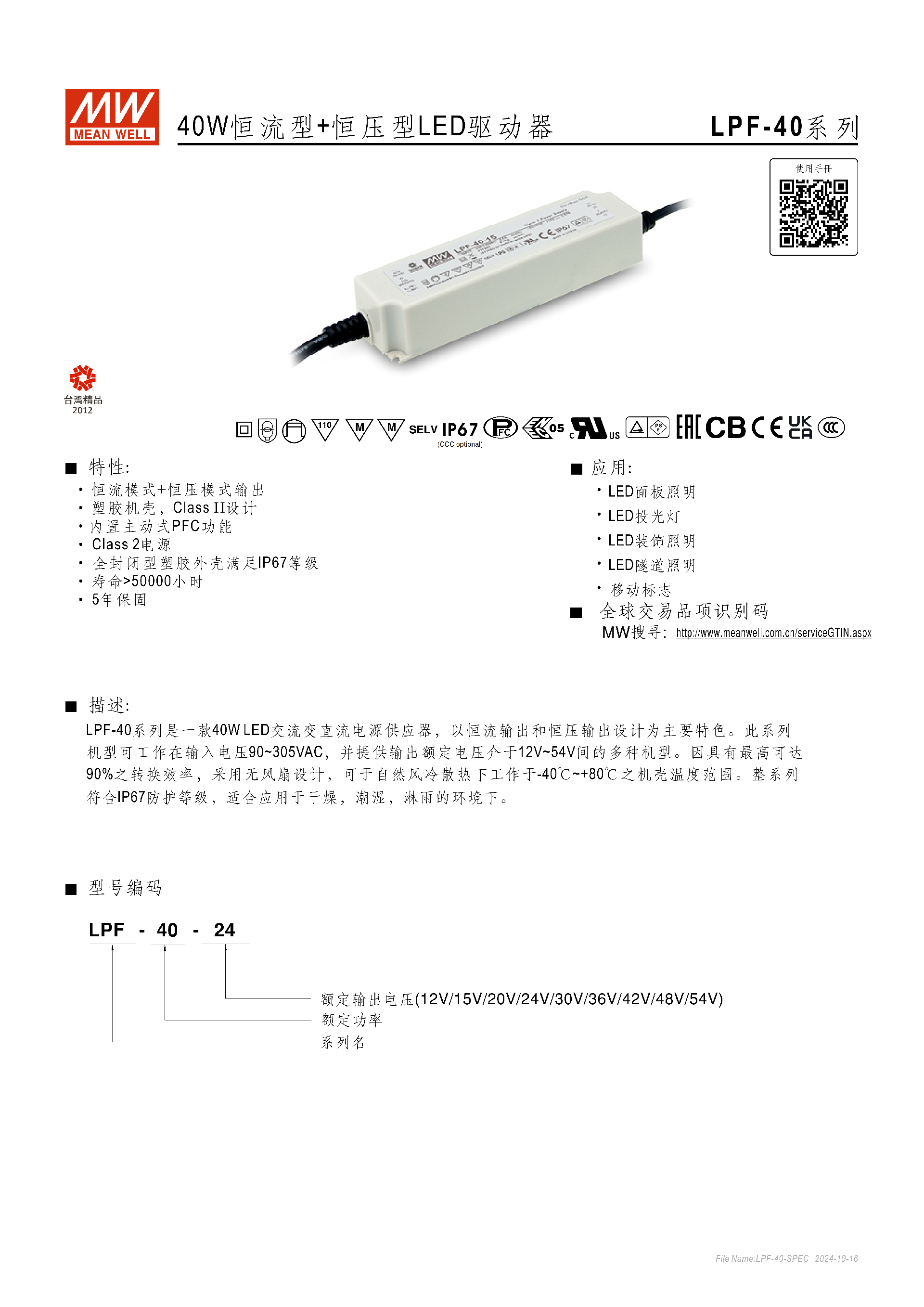 LPF-40 系列是明緯生產(chǎn)的40W 恒流 + 恒壓雙模式LED 交流變直流驅(qū)動器,為 2012 年臺灣精品認(rèn)證產(chǎn)品,核心適用于各類 LED 照明場景,具備以下核心基礎(chǔ)特性: