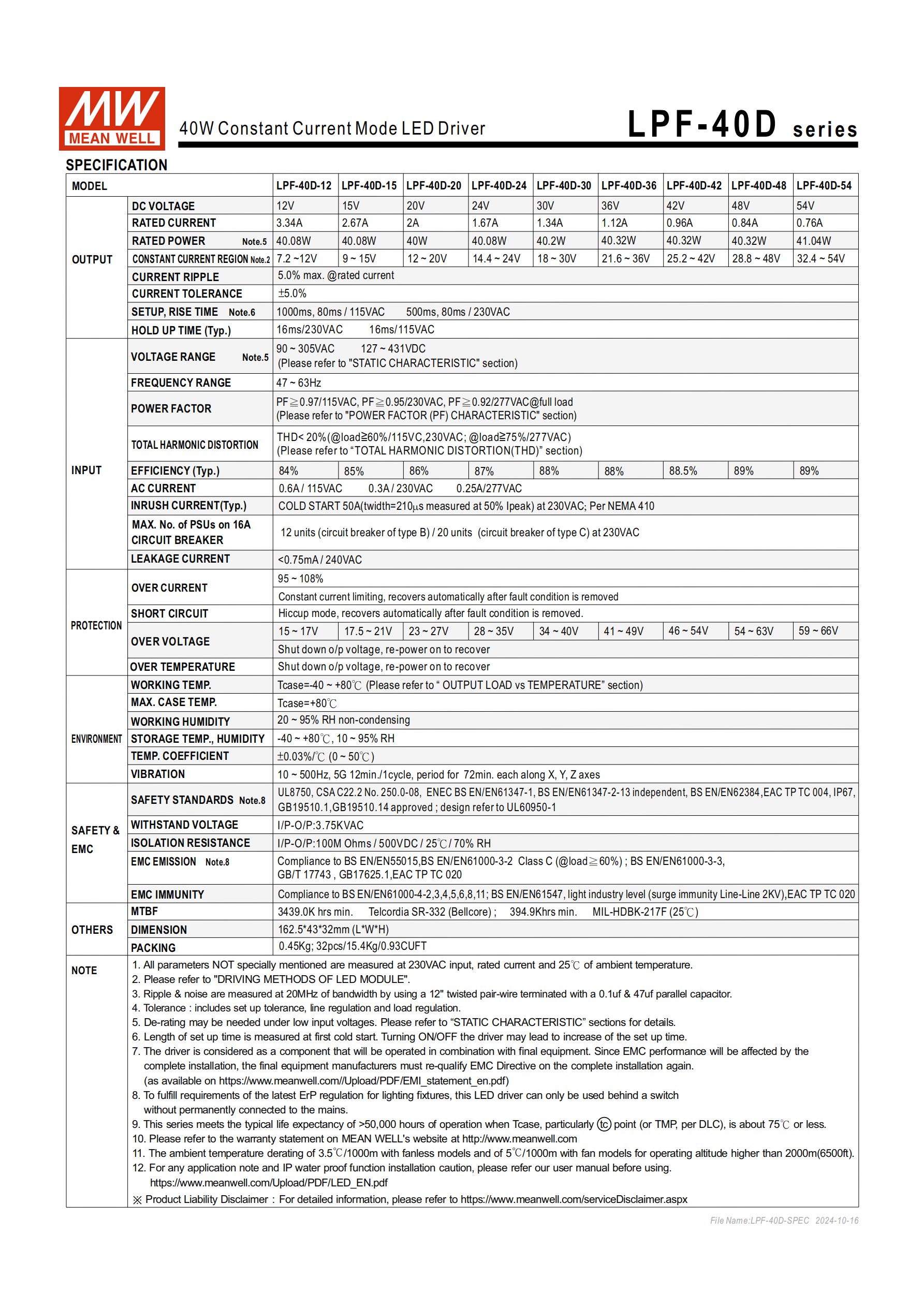 | LPF-40D-54 | 54V | 0.76A | 41.04W | 32.4~54V | 89% |