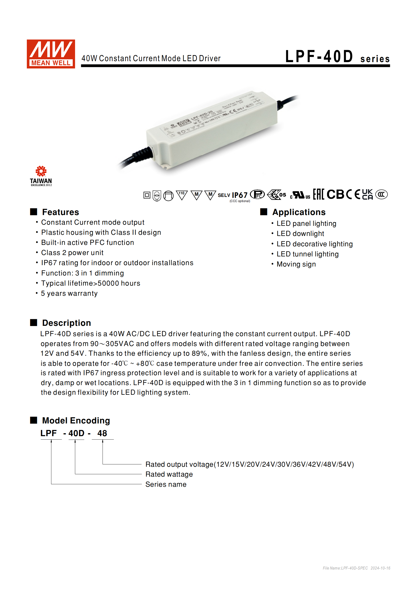 明緯 LPF-40D 系列為40W 恒流型 LED 驅(qū)動器,屬于交流變直流電源供應(yīng)器,核心設(shè)計為恒流輸出,適配多種 LED 照明場景,具備戶內(nèi)戶外通用的安裝屬性,提供5 年保固,正常使用下壽命 **>50000 小時 **(外殼最高溫度 Tc 低于 75℃時)。