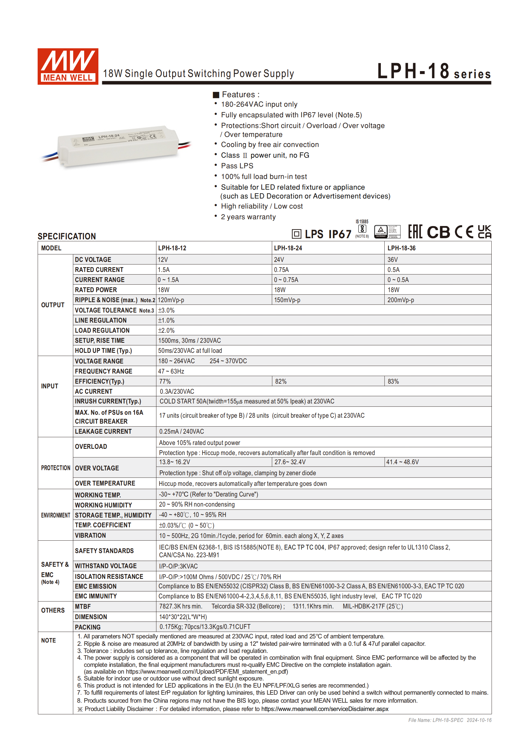 明緯LPH-18 系列為 18W 單組輸出開(kāi)關(guān)電源,適配180~264VAC輸入,擁有 12V/24V/36V 三種輸出規(guī)格,配備IP67 等級(jí)全防護(hù)型絕緣塑膠外殼,屬 Class Ⅱ 電源無(wú) FG 且通過(guò) LPS 測(cè)試,具備短路、過(guò)負(fù)載等全方面保護(hù)功能,自然風(fēng)冷設(shè)計(jì),經(jīng) 100% 滿載老化測(cè)試,可靠性高、成本低,適配 LED 裝飾 / 廣告照明等裝置,工作溫度 **-30~+70℃**,提供 2 年保固,同時(shí)滿足多項(xiàng)安規(guī)與電磁兼容標(biāo)準(zhǔn),MTBF 值達(dá) 7827.3K hrs min.(Telcordia SR-332)。