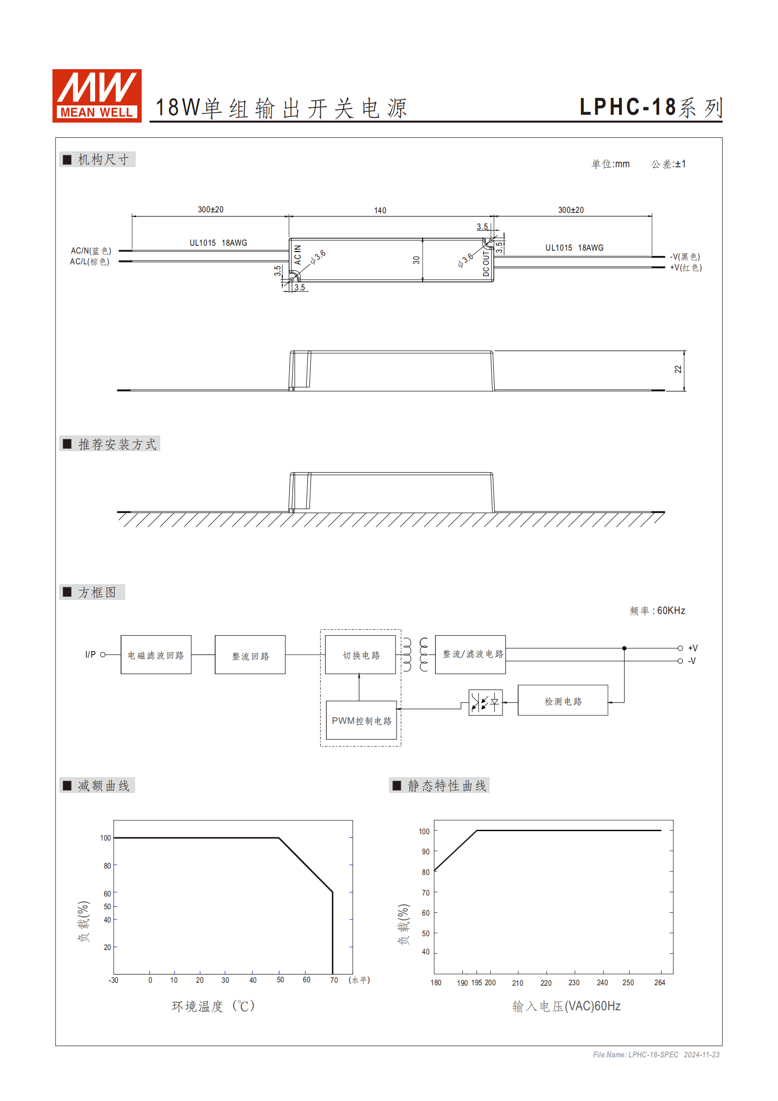 線材規(guī)格:AC/DC 端均為 UL1015 18AWG,AC 端棕色為 L、藍(lán)色為 N,DC 端紅色為 + V、黑色為 - V;