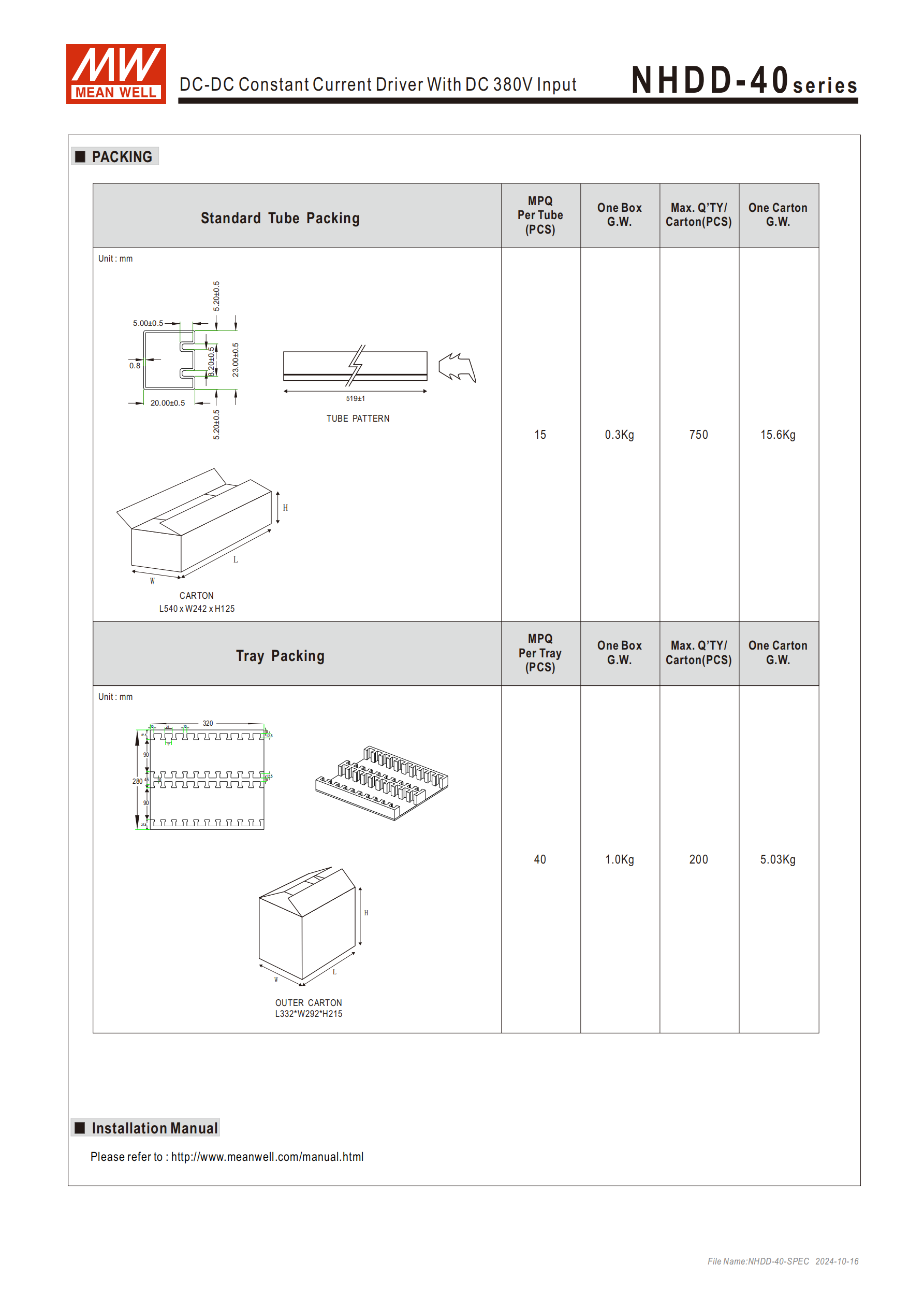 包裝類型:兩種標準包裝,參數(shù)如下表:| 包裝類型 | 最小包裝數(shù)量 | 單包裝毛重 | 最大裝箱數(shù) | 整箱毛重 ||----------|--------------|------------|------------|----------|| 套管包裝 | 15 PCS / 管 | 0.3Kg / 管 | 750 PCS / 箱 | 15.6Kg / 箱 || 托盤式包裝 | 40 PCS / 盤 | 1.0Kg / 盤 | 200 PCS / 箱 | 5.03Kg / 箱 |