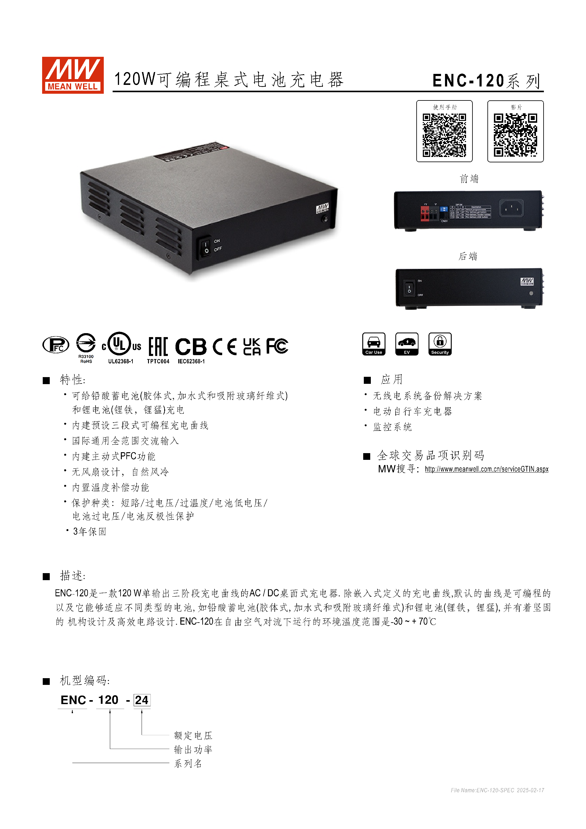 ENC-120 系列是明緯推出的120W 可編程桌式電池充電器,支持鉛酸蓄電池(膠體、加水、吸附玻璃纖維式)和鋰電池(鋰鐵、鋰猛)充電,具備三段式可編程充電曲線,擁有 **-30~+70℃寬工作溫度、無風(fēng)扇自然風(fēng)冷設(shè)計,內(nèi)置主動式 PFC和溫度補(bǔ)償功能,提供短路、過壓、過溫、反極性等多重保護(hù),有12V/24V/48V** 三款核心機(jī)型,適配不同容量電池,通過多項國際安規(guī)認(rèn)證,提供 3 年保固,適用于無線電系統(tǒng)備份、電動自行車、監(jiān)控系統(tǒng)等場景。