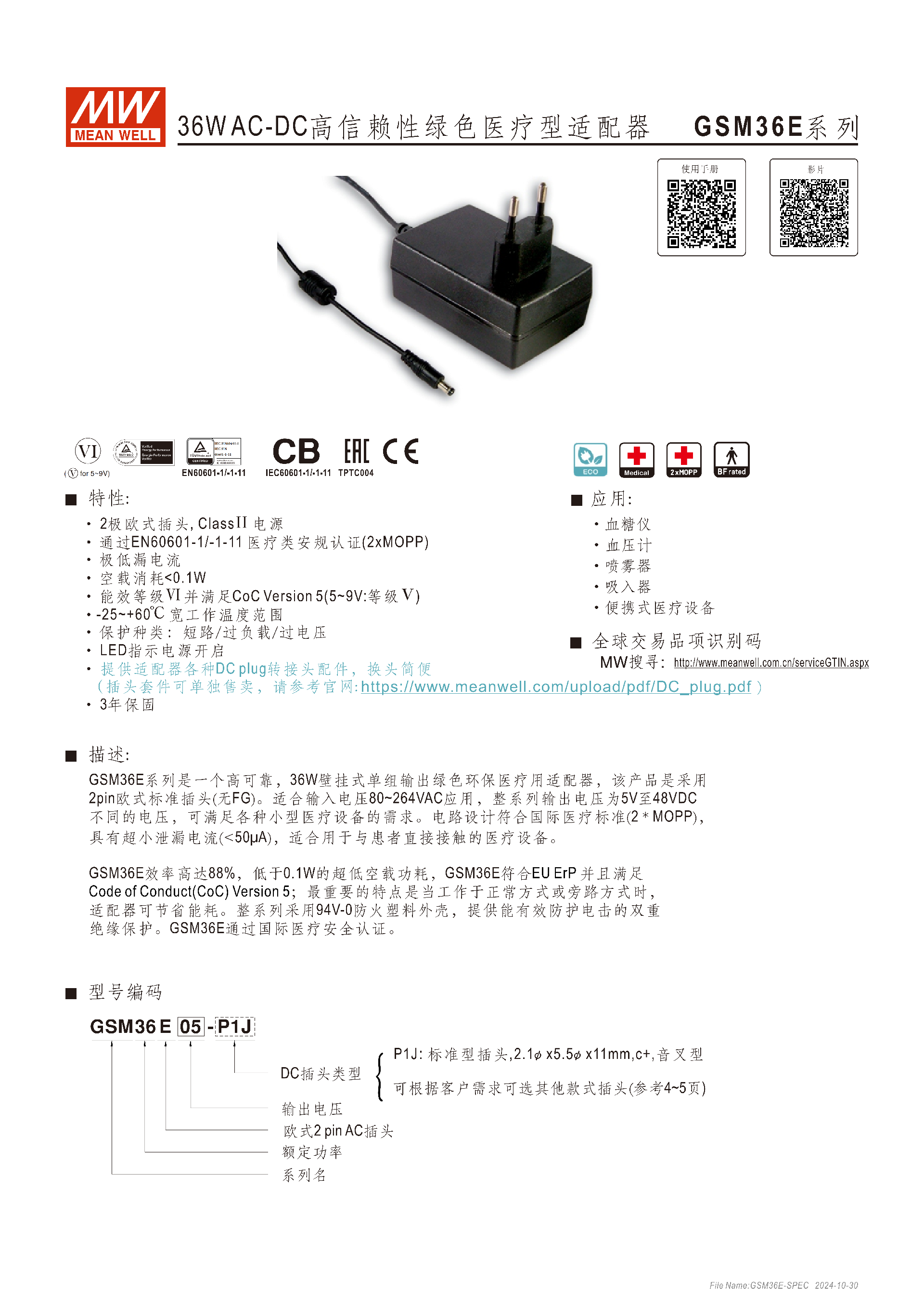 明緯 GSM36E 系列是 36W 壁掛式 AC-DC 綠色環(huán)保醫(yī)療型適配器,采用2 極歐式插頭、Class Ⅱ 電源設計,通過EN60601-1/-1-11醫(yī)療安規(guī)認證(2xMOPP),漏電流 < 50μA,空載消耗 < 0.1W,能效達 Ⅵ 級(5~9V 為 Ⅴ 級),工作溫度 - 25~+60℃,具備短路 / 過負載 / 過電壓三重保護,輸出電壓覆蓋 5~48VDC,適配血糖儀、血壓計等便攜式醫(yī)療設備,提供 3 年保固,支持 DC 插頭定制與快速更換,外殼為 94V-0 防火塑料,雙重絕緣防護,MTBF 值達 3777.8K hrs min. 以上。