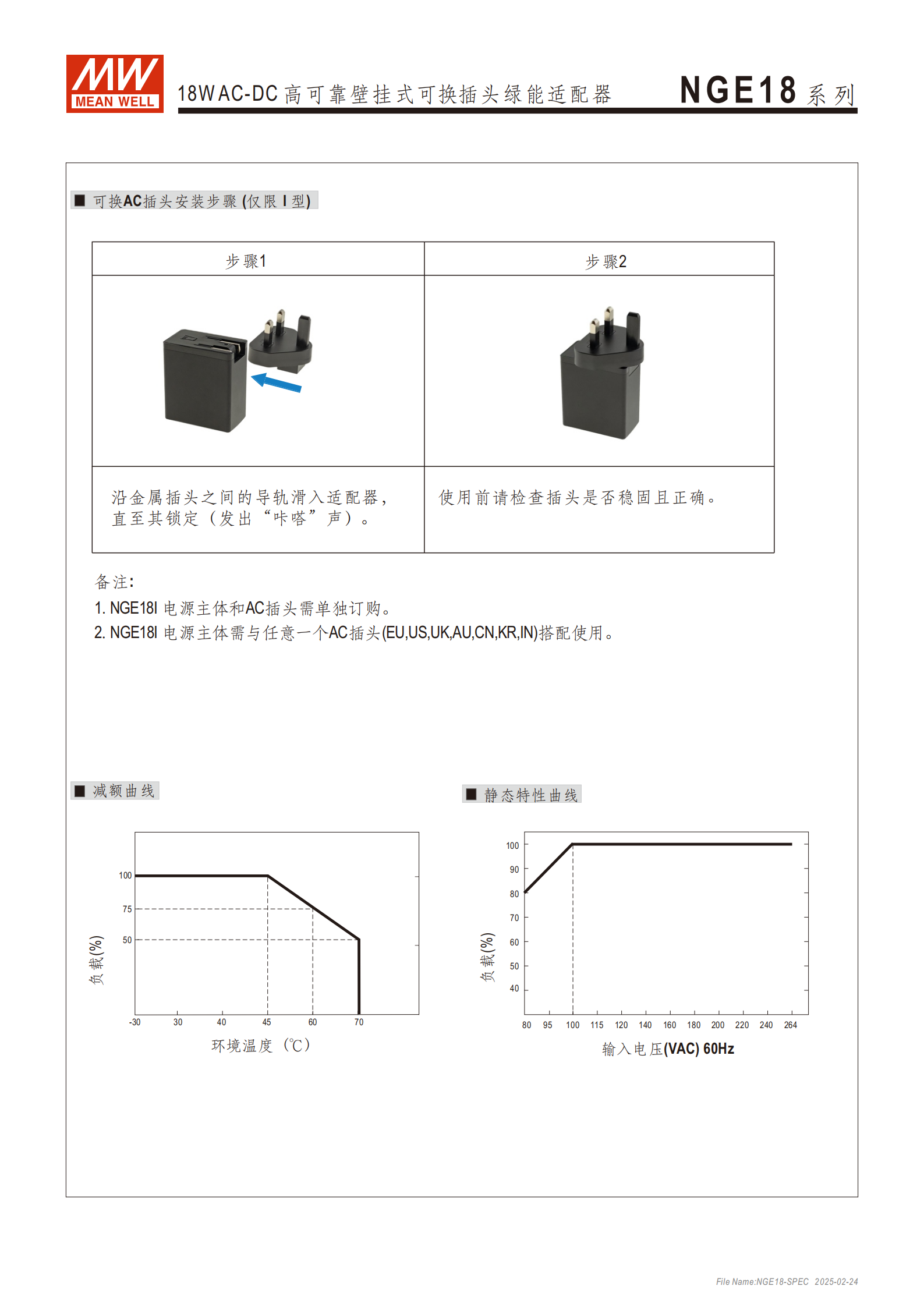 答案:NGE18 系列分國際版 (I)、歐規(guī)版 (E)、美規(guī)版 (U),AC 插頭差異為:I 型支持 EU/US/UK/AU/CN/KR/IN 七種插頭更換,插腳固定不可折疊;E 型插頭不可換,插腳固定不可折疊;U 型插頭不可換,插腳可折疊。國際版 (I) 的特殊要求:①電源主體與 AC 插頭需單獨訂購;②主體必須與任意一款 7 種 AC 插頭搭配使用,不可單獨使用;③插頭安裝為導(dǎo)軌滑入鎖定式,需確認(rèn)安裝后發(fā)出 “咔嗒” 聲保證穩(wěn)固。