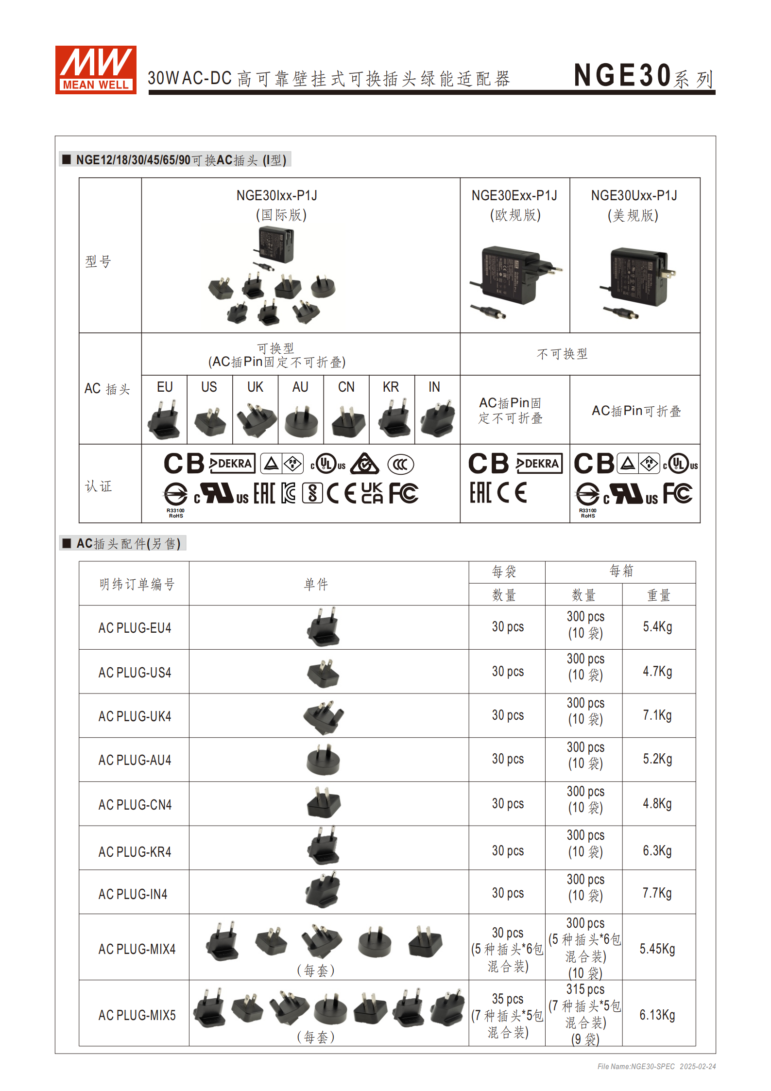 NGE30 系列分 3 款核心型號(hào),核心差異為 AC 插頭設(shè)計(jì),具體如下: