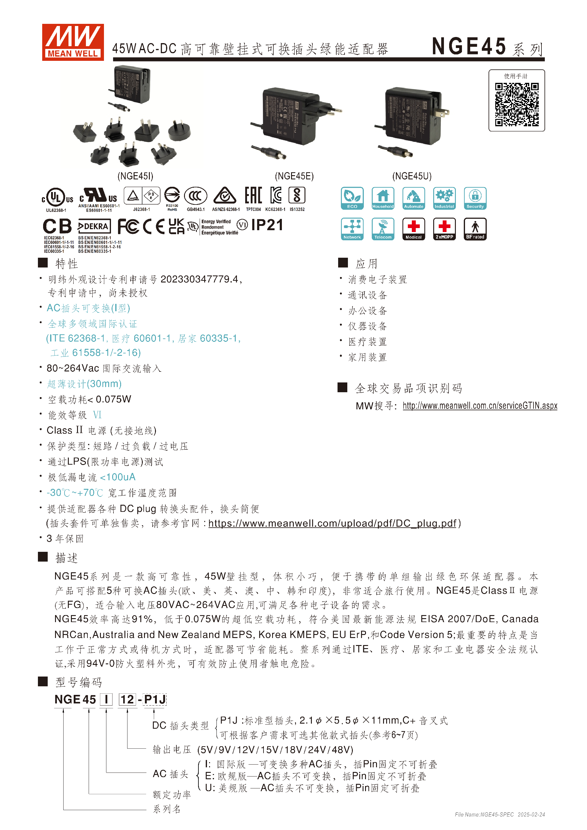 NGE45 系列是明緯推出的45W AC-DC 高可靠壁掛式可換插頭綠能適配器,擁有國際版 (I)、歐規(guī)版 (E)、美規(guī)版 (U)三種類型,具備80~264VAC 寬電壓輸入、-30℃~+70℃寬工作溫度、空載功耗 < 0.075W、漏電流 < 100uA等核心特性,效率最高達91%且符合能效等級 Ⅵ,通過 IEC62368-1、IEC60601-1 等全球多領域國際認證,適配消費電子、醫(yī)療裝置等多類設備,標配P1J 型 DC 插頭且支持多種轉接頭更換,AC 插頭可按需選配(I 型支持多地區(qū)插頭更換),提供3 年保固,MTBF 值最低達749.9Khrs,整體采用超薄 30mm 設計,體積小巧且防護等級為 IP21。