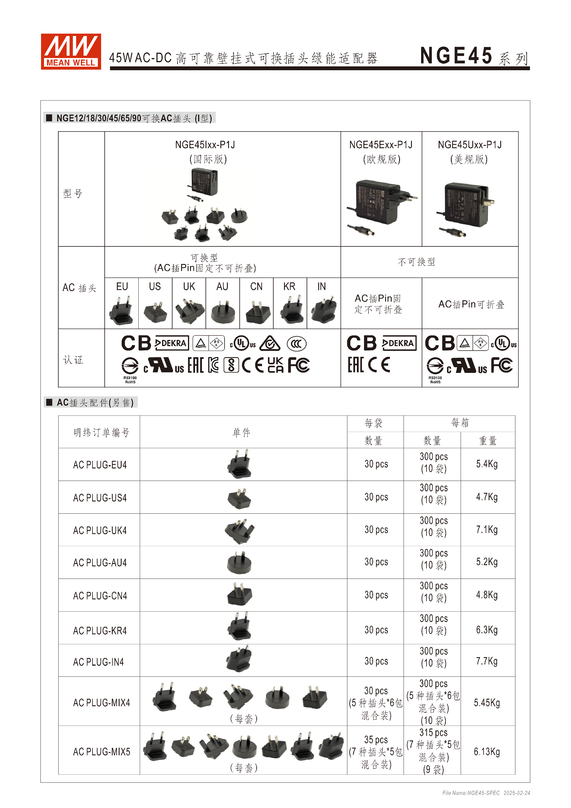 AC 插頭配件:I 型需單獨訂購 AC 插頭,支持 EU/US/UK/AU/CN/KR/IN7 種地區(qū)插頭,均為單獨售賣,有單款裝 / 混合裝(MIX4/MIX5),如 AC PLUG-EU4 每箱 300pcs(10 袋 ×30pcs)重 5.4Kg