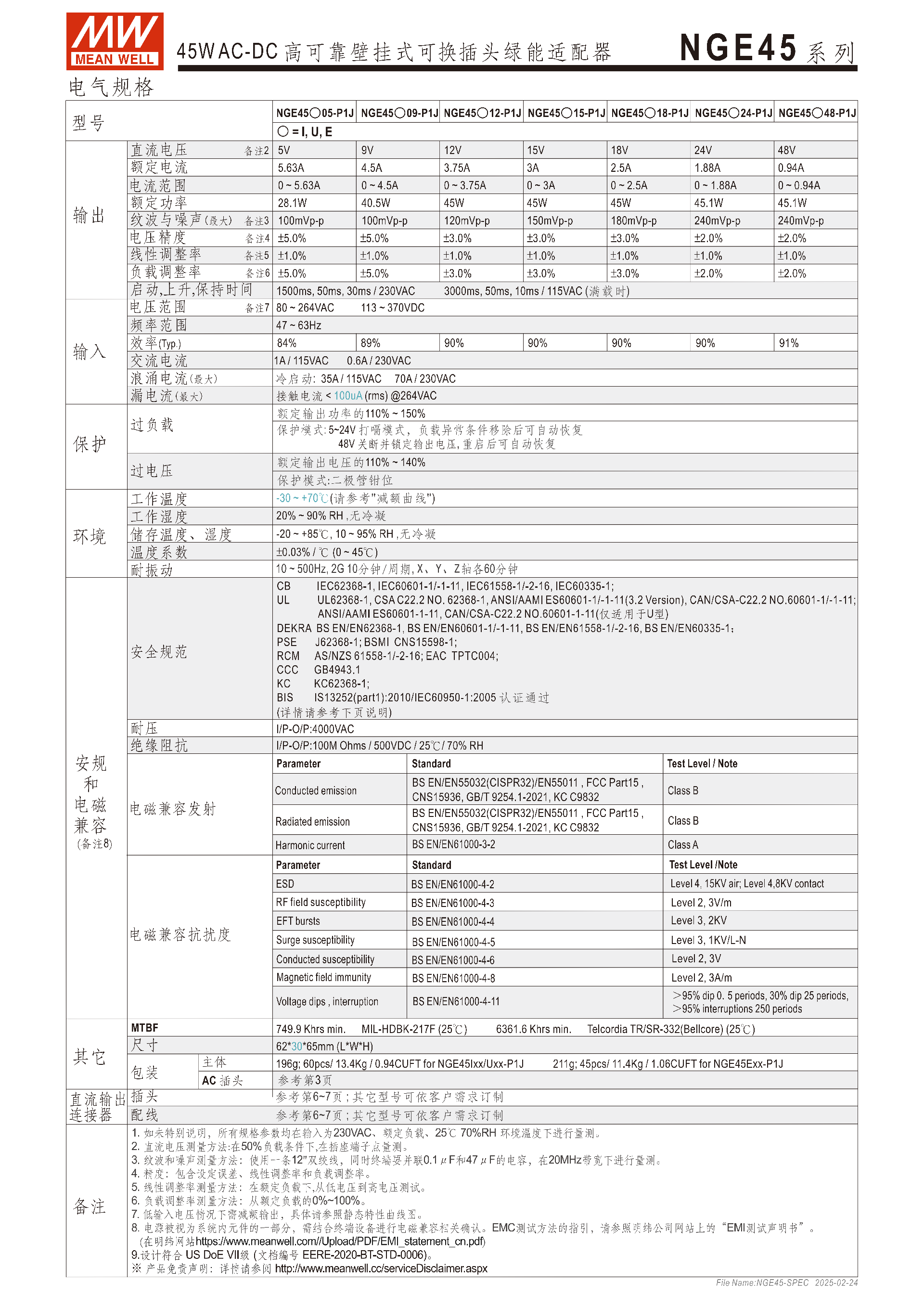 NGE45+[AC插頭類型]+[輸出電壓]+P1J輸出電壓可選:5V/9V/12V/15V/18V/24V/48V