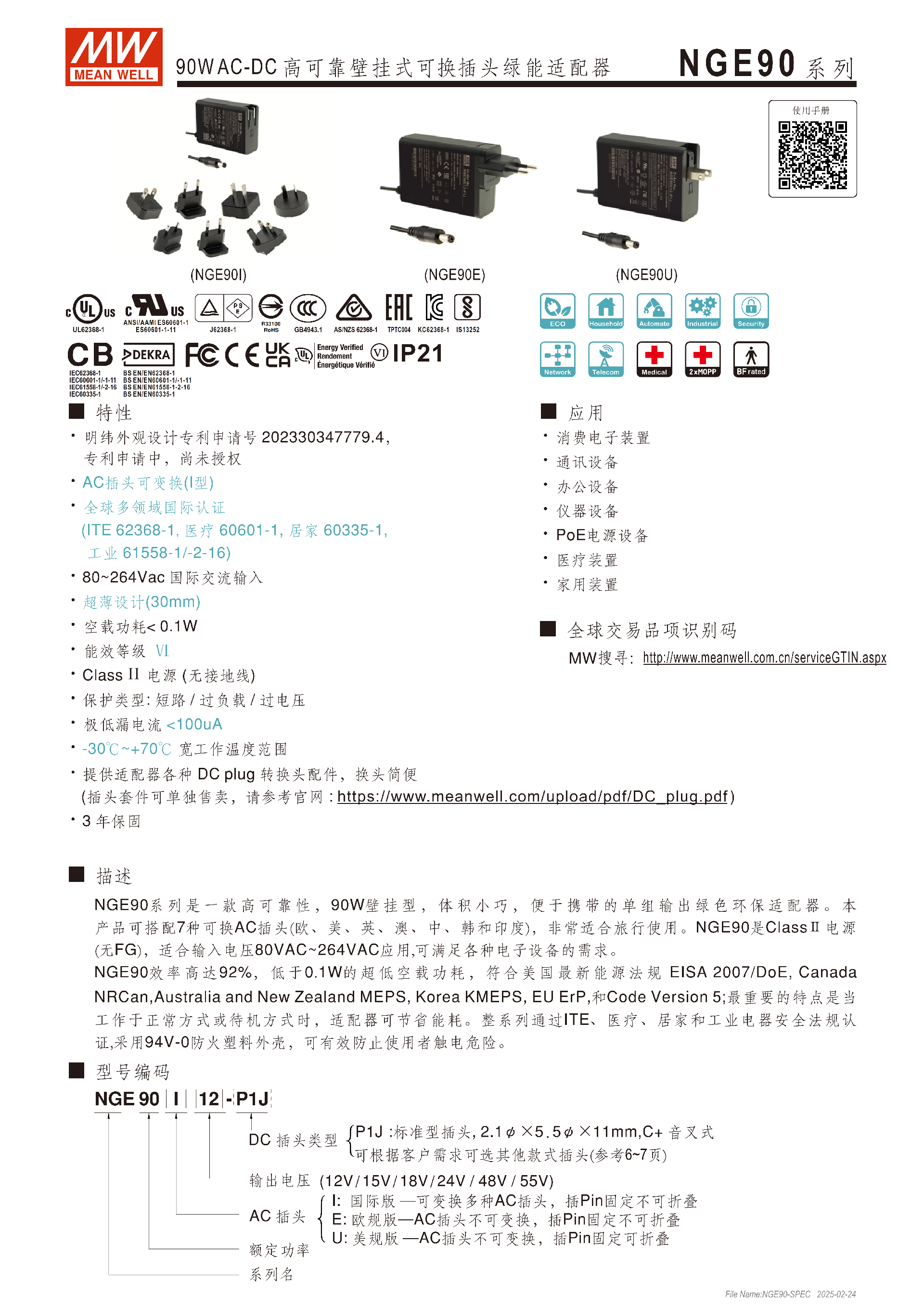 NGE90 系列是明緯推出的 90W AC-DC 高可靠壁掛式可換插頭綠能適配器,含I(國際版)、E(歐規(guī)版)、U(美規(guī)版)三款型號,擁有全球多領(lǐng)域國際認(rèn)證,支持80~264VAC 國際交流輸入、-30℃~+70℃寬工作溫度,具備超薄 30mm 設(shè)計、空載功耗 < 0.1W、能效等級 Ⅵ 等綠能特性,提供 12V/15V/18V/24V/48V/55V 多種直流輸出,配備短路 / 過負(fù)載 / 過電壓保護(hù),極低漏電流 < 100μA,AC/DC 插頭均可靈活更換(國際版支持 7 種 AC 插頭更換),外殼為 94V-0 防火材質(zhì),享有3 年保固,適用于消費(fèi)電子、通訊、辦公、儀器、醫(yī)療、家用等多類設(shè)備。