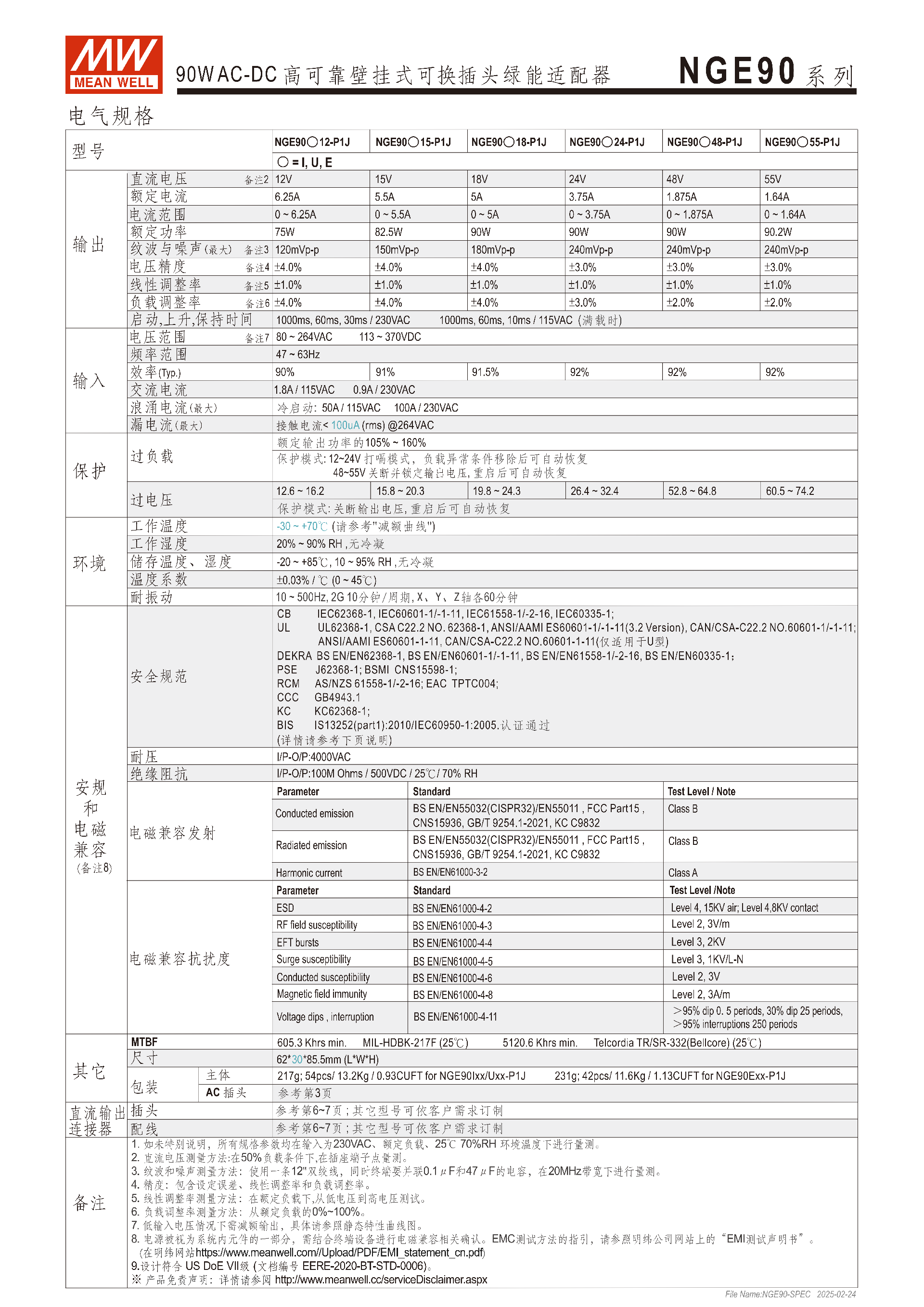 輸出規(guī)格:提供 6 種直流輸出,核心參數(shù)如下(230VAC、額定負(fù)載、25℃/70% RH 下測量):| 型號 | 輸出電壓 | 額定電流 | 額定功率 | 紋波噪聲(最大) | 電壓精度 | 效率(Typ.) ||------|----------|----------|----------|------------------|----------|--------------|| NGE90 12-P1J | 12V | 6.25A | 75W | 120mVp-p | ±4.0% | 90% || NGE90 15-P1J | 15V | 5.5A | 82.5W | 150mVp-p | ±3.0% | 91% || NGE90 18-P1J | 18V | 5A | 90W | 180mVp-p | ±3.0% | 91.5% || NGE90 24-P1J | 24V | 3.75A | 90W | 240mVp-p | ±4.0% | 92% || NGE90 48-P1J | 48V | 1.875A | 90W | 240mVp-p | ±4.0% | 92% || NGE90 55-P1J | 55V | 1.64A | 90.2W | 240mVp-p | ±4.0% | 92% |
