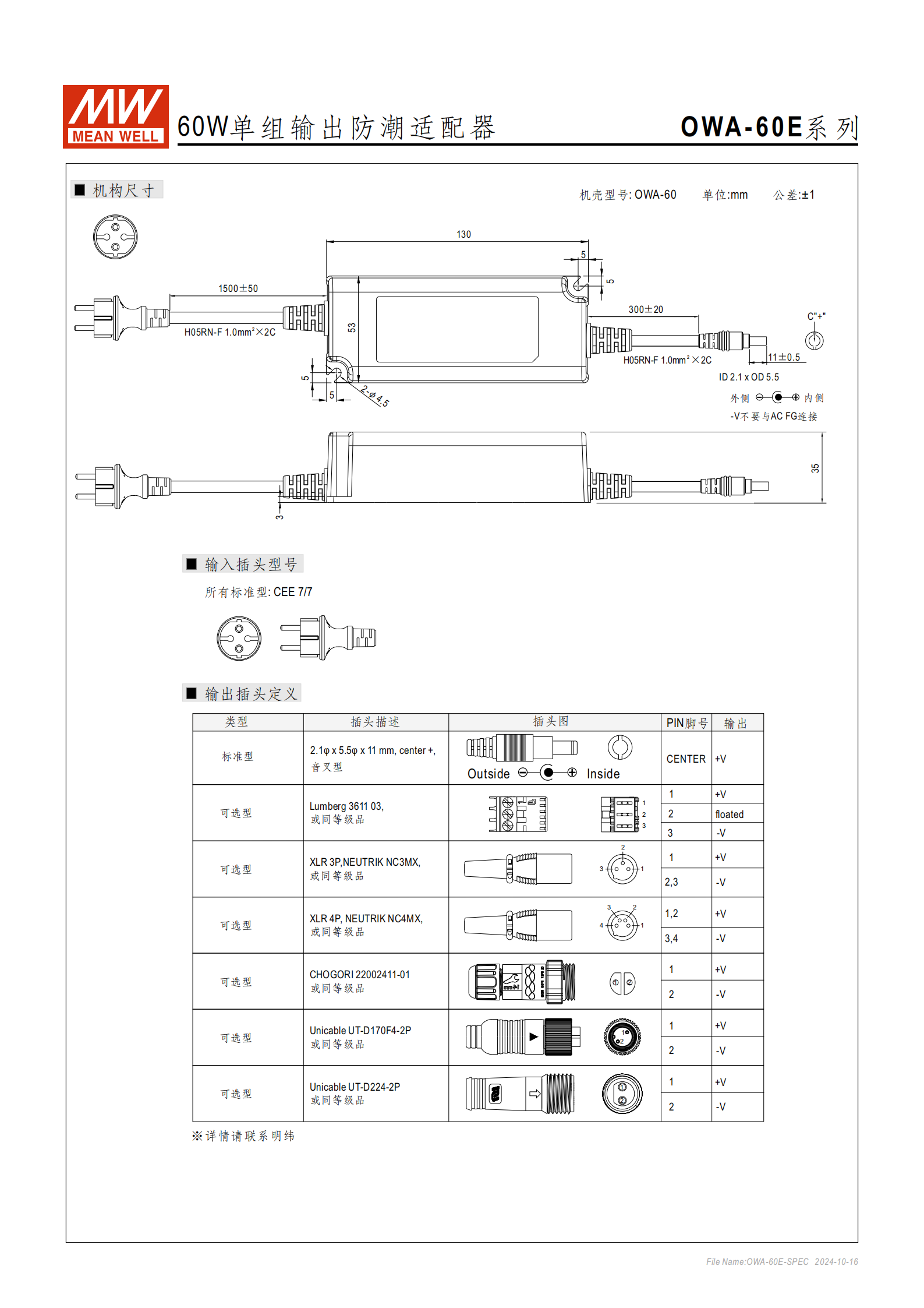 插頭配件:輸入插頭為標(biāo)準(zhǔn) CEE 7/7 歐式 AC 插頭;輸出提供多款 DC plug 轉(zhuǎn)接頭(可單獨(dú)售賣(mài),詳情參考明緯官網(wǎng)),輸出插頭以中心正極為主要定義 注意 - V 端禁止與 AC FG 連接。