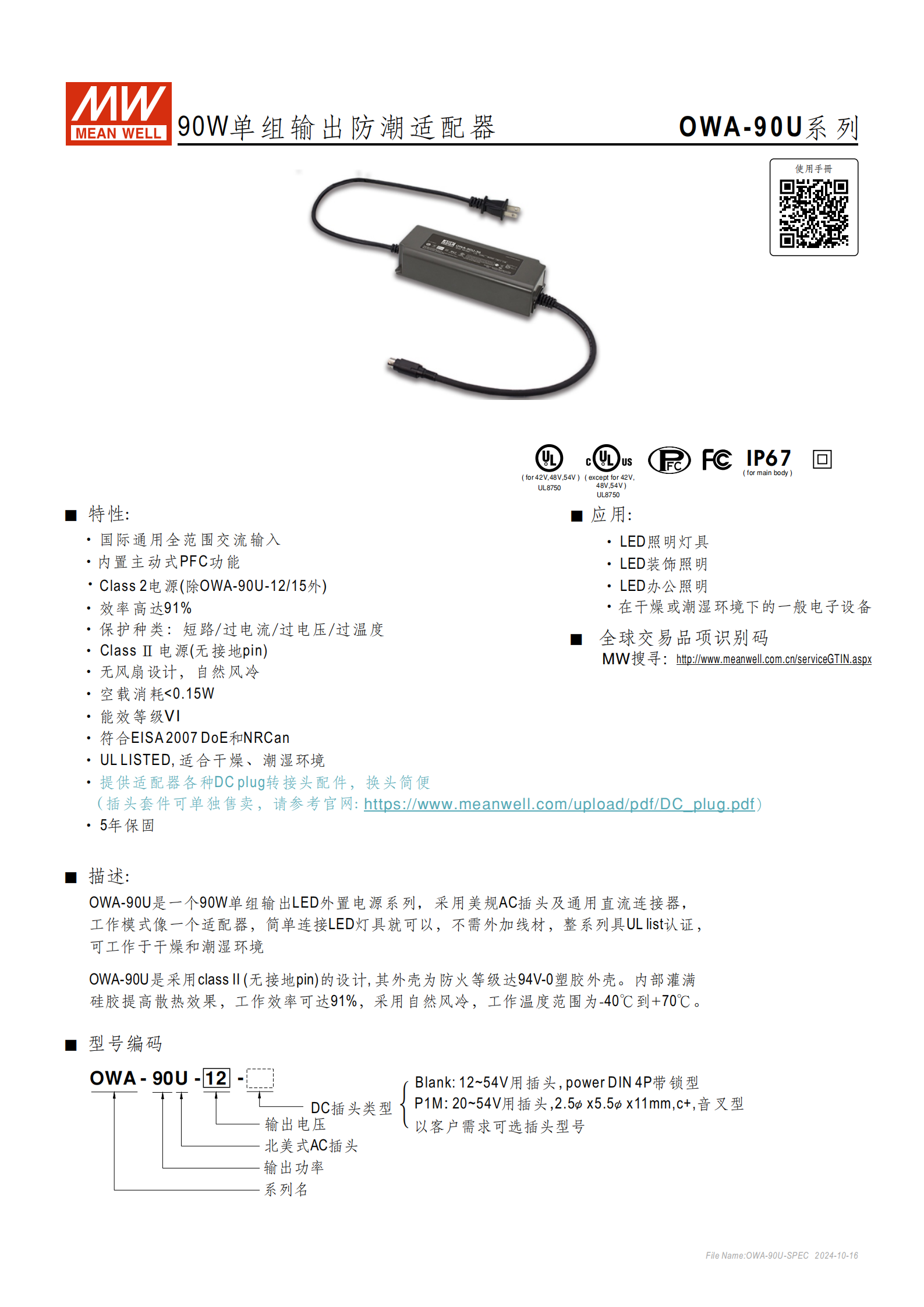 明緯 OWA-90U 系列是 90W 單組輸出的 LED 外置防潮適配器,采用Class Ⅱ 無接地設計、IP67 防護(僅主體),配備美規(guī) AC 插頭與通用 DC 連接器,外殼為 94V-0 防火塑膠且內(nèi)部灌硅膠散熱,支持 **-40℃~+70℃** 工作溫度、90~264VAC 全范圍交流輸入,內(nèi)置主動式 PFC 功能,功率因數(shù)滿載時 115VAC 下 PF>0.98、230VAC 下 PF>0.96,最高效率達91%,空載消耗 < 0.15W,具備短路 / 過流 / 過壓 / 過溫四重保護且部分保護可自動恢復,全系列 UL8750 認證,適配 LED 各類照明及干 / 潮濕環(huán)境一般電子設備,提供 5 年保固,還可選配多種 DC 插頭轉接頭,換頭簡便。