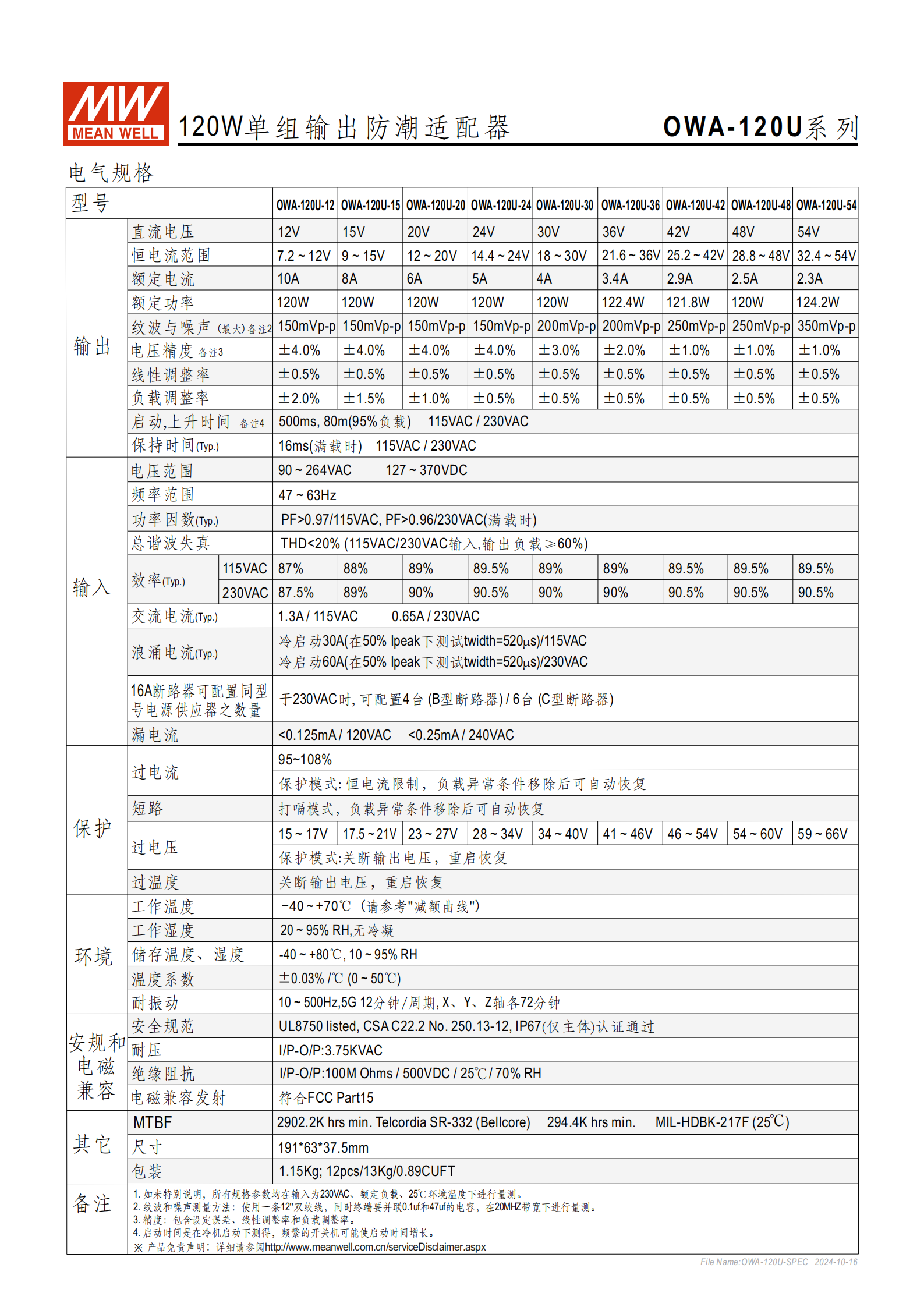 | OWA-120U-54 | 54V | 2.3A | 124.2W | 350mVp-p | ±1.0% | 32.4~54V |